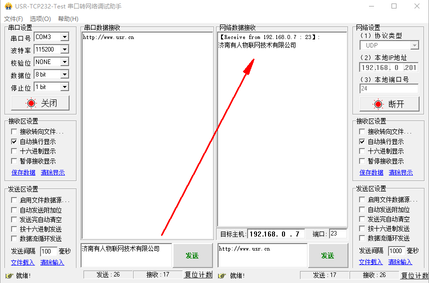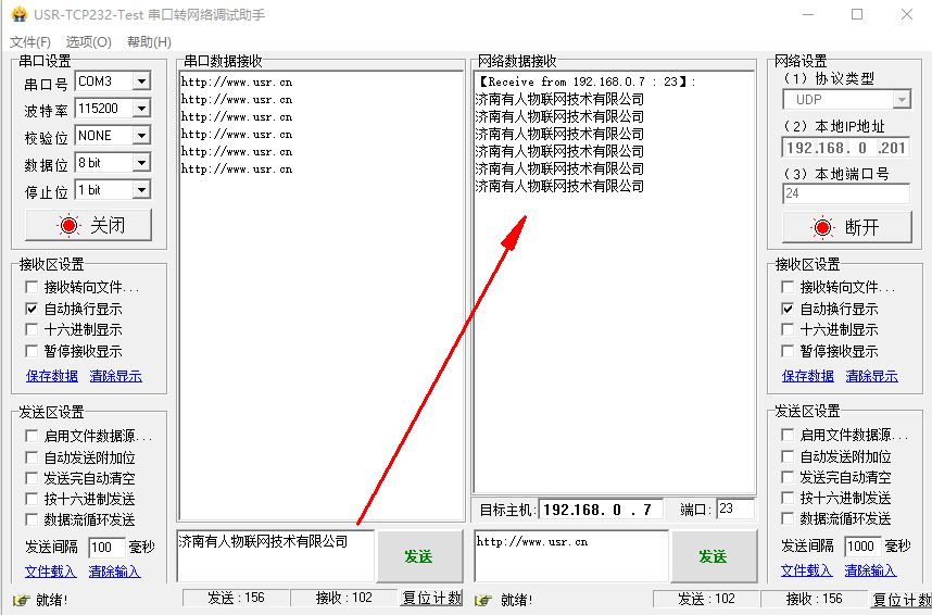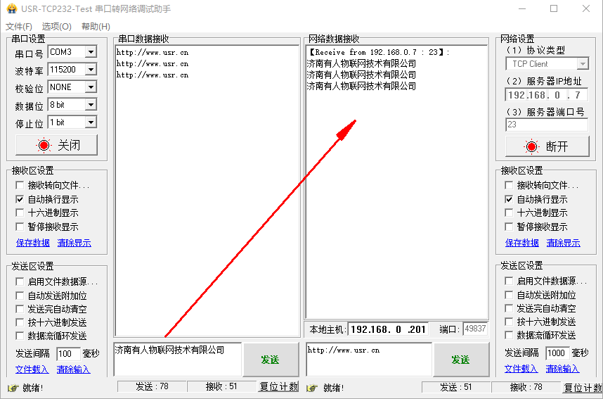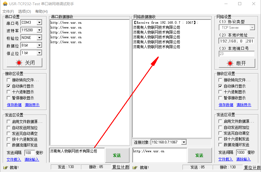 點擊連接,有連接對象之后,測試串口和網(wǎng)絡之間的數(shù)據(jù)傳輸。