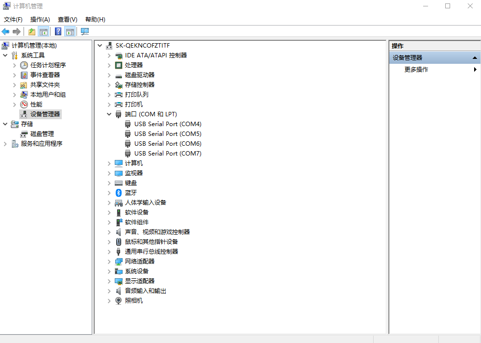 電腦鼠標(biāo)點(diǎn)擊計(jì)算器管理,右擊,點(diǎn)開設(shè)備管理器,點(diǎn)擊端口,查看USB-RS232串口線的COM口號。