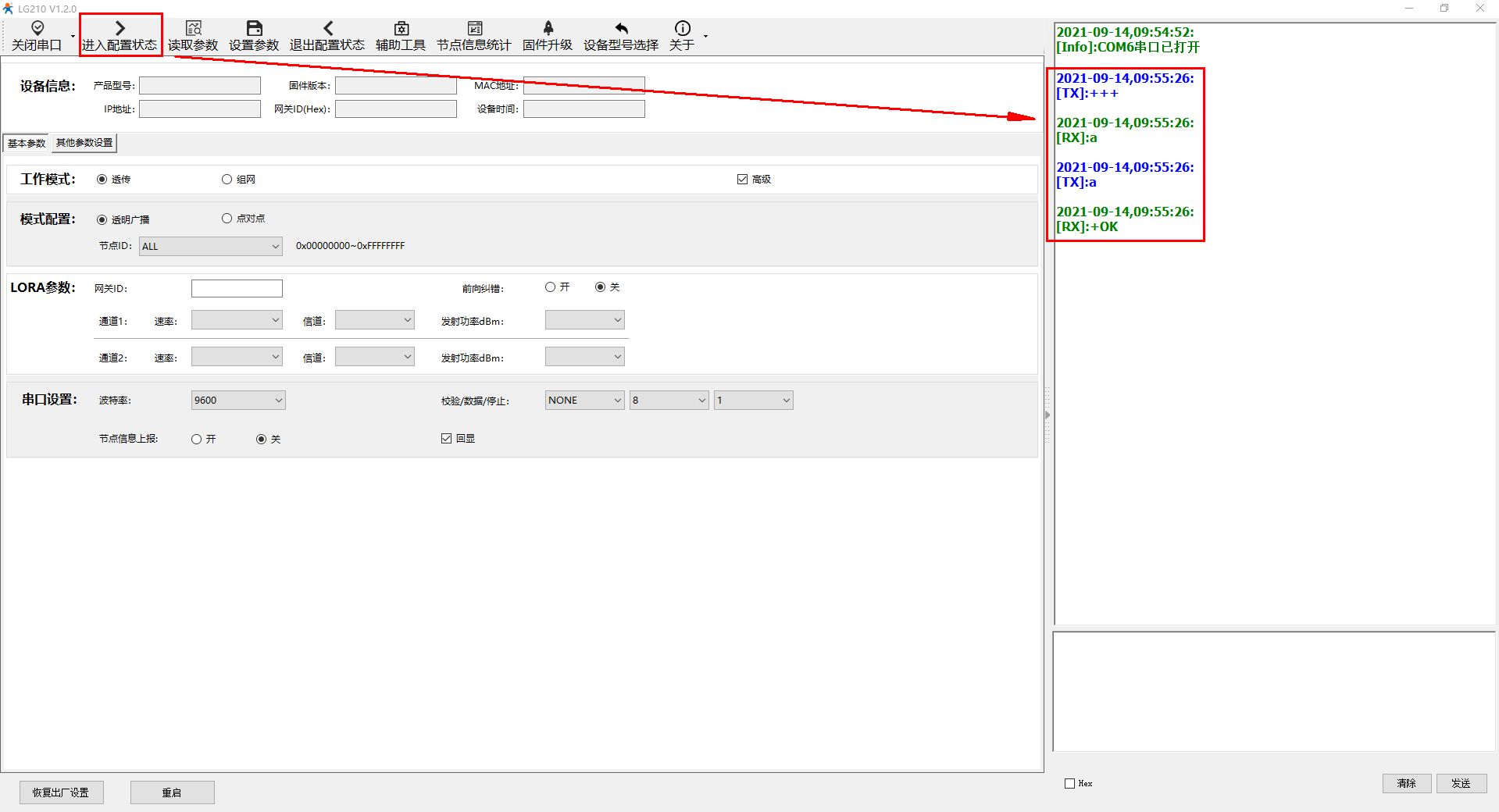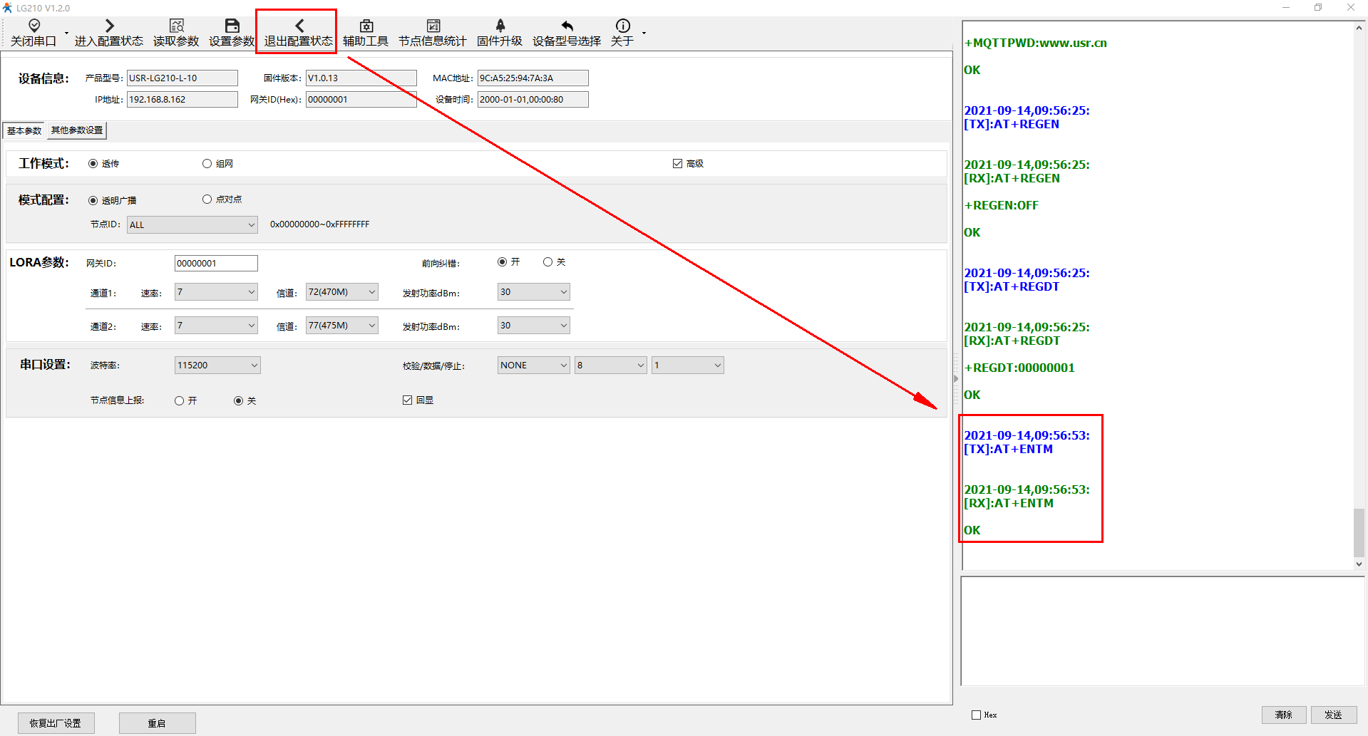 打開串口,點(diǎn)擊進(jìn)入配置狀態(tài),返回+++a,a+Ok,接著讀取參數(shù),可以正常讀取參數(shù)后,點(diǎn)擊退出配置狀態(tài)。