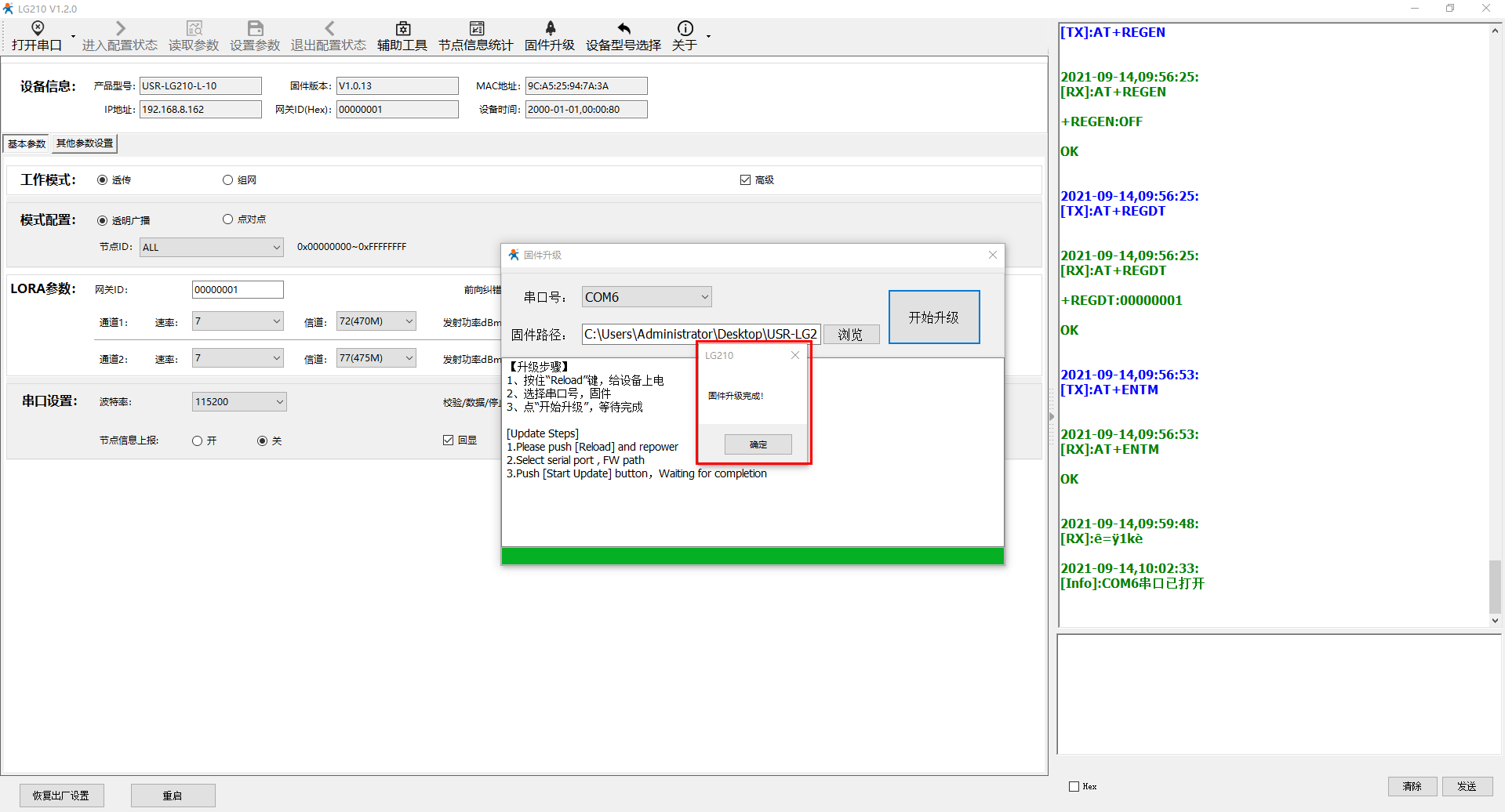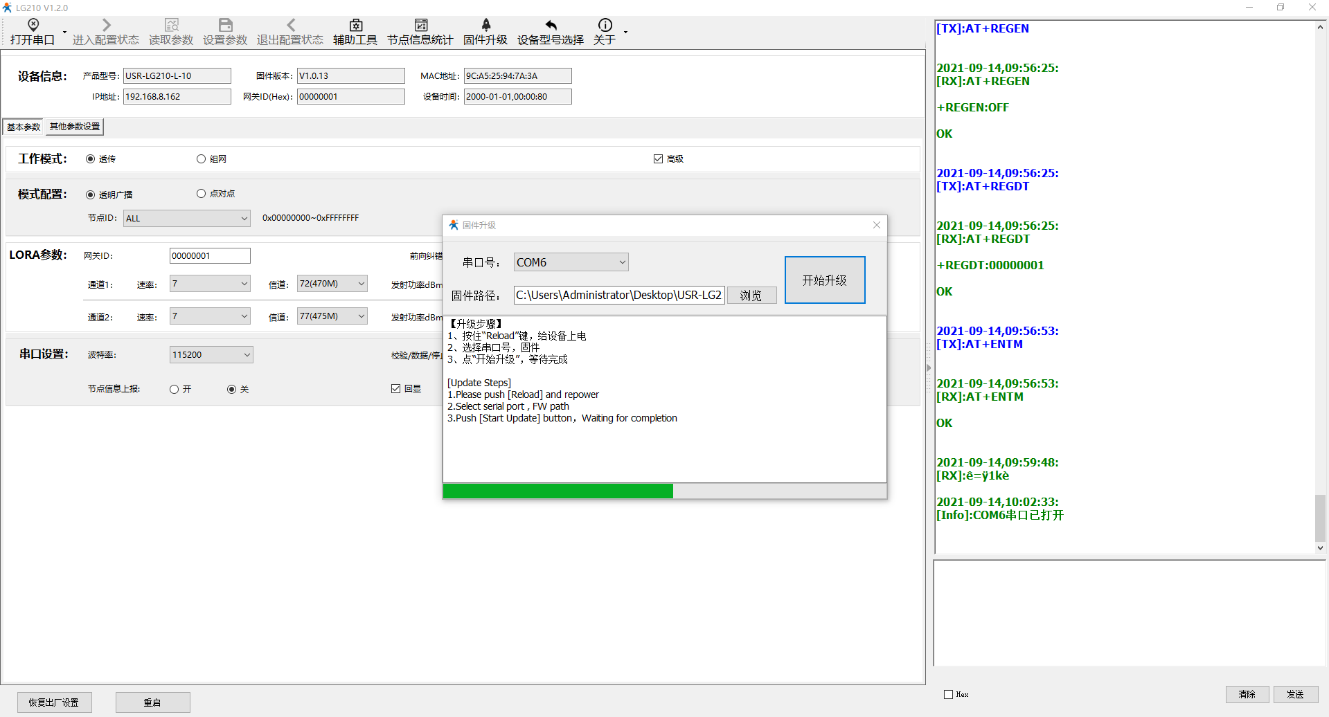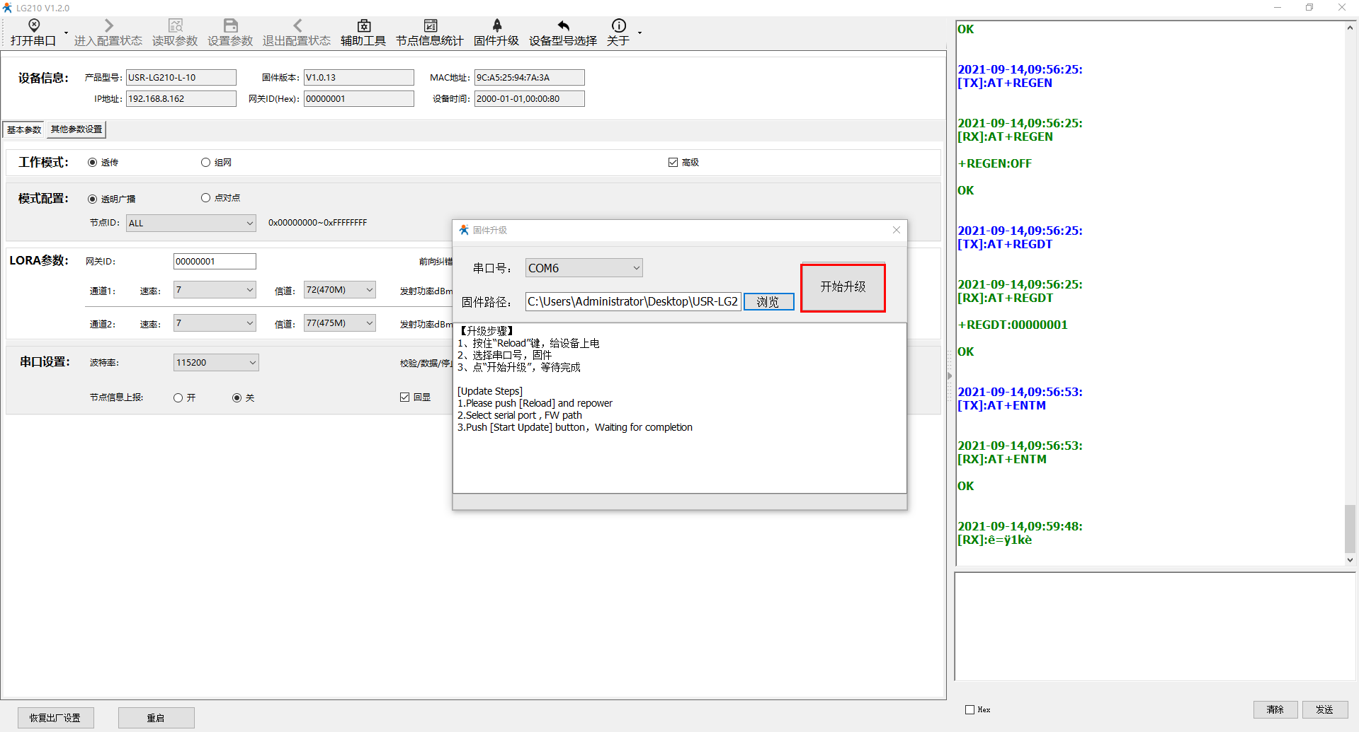 驗(yàn)證USB-RS232串口線通訊正常,接著就可以對USR-LG210-L進(jìn)行固件升級。