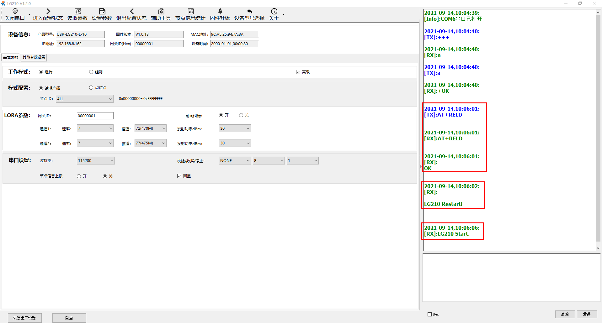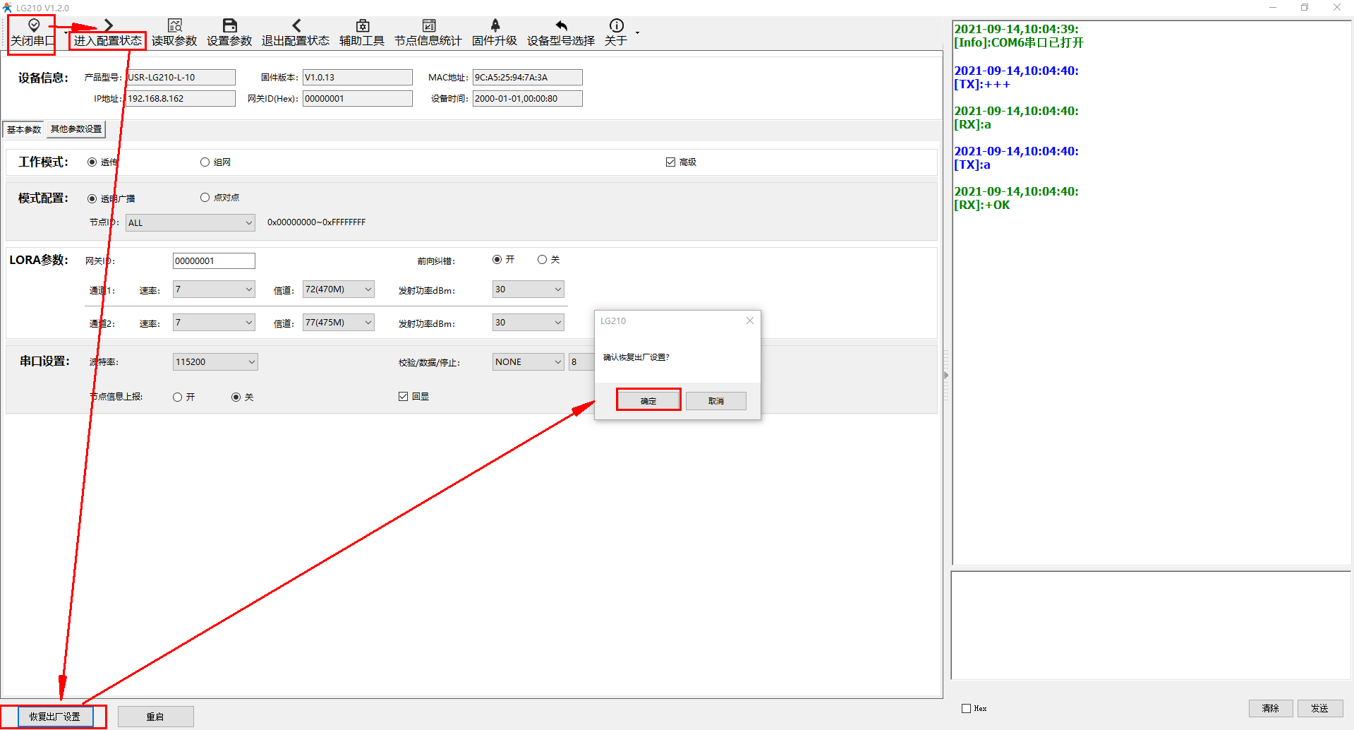 升級完成,USR-LG210-L使用設(shè)置軟件,打開串口,點(diǎn)擊進(jìn)入配置狀態(tài),點(diǎn)擊恢復(fù)出廠值。進(jìn)行恢復(fù)出廠值設(shè)置,恢復(fù)出廠值成功后,可以對USR-LG210-L進(jìn)行參數(shù)設(shè)置。