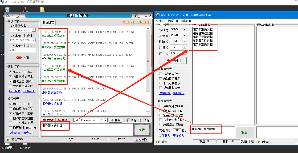 6.數(shù)據(jù)收發(fā)測試:等待G806s重啟成功,和服務(wù)器建立連接,在電腦端和服務(wù)器端分別打開串口網(wǎng)絡(luò)二合一調(diào)試助手,實(shí)現(xiàn)G806s的串口和服務(wù)器端的數(shù)據(jù)通訊。