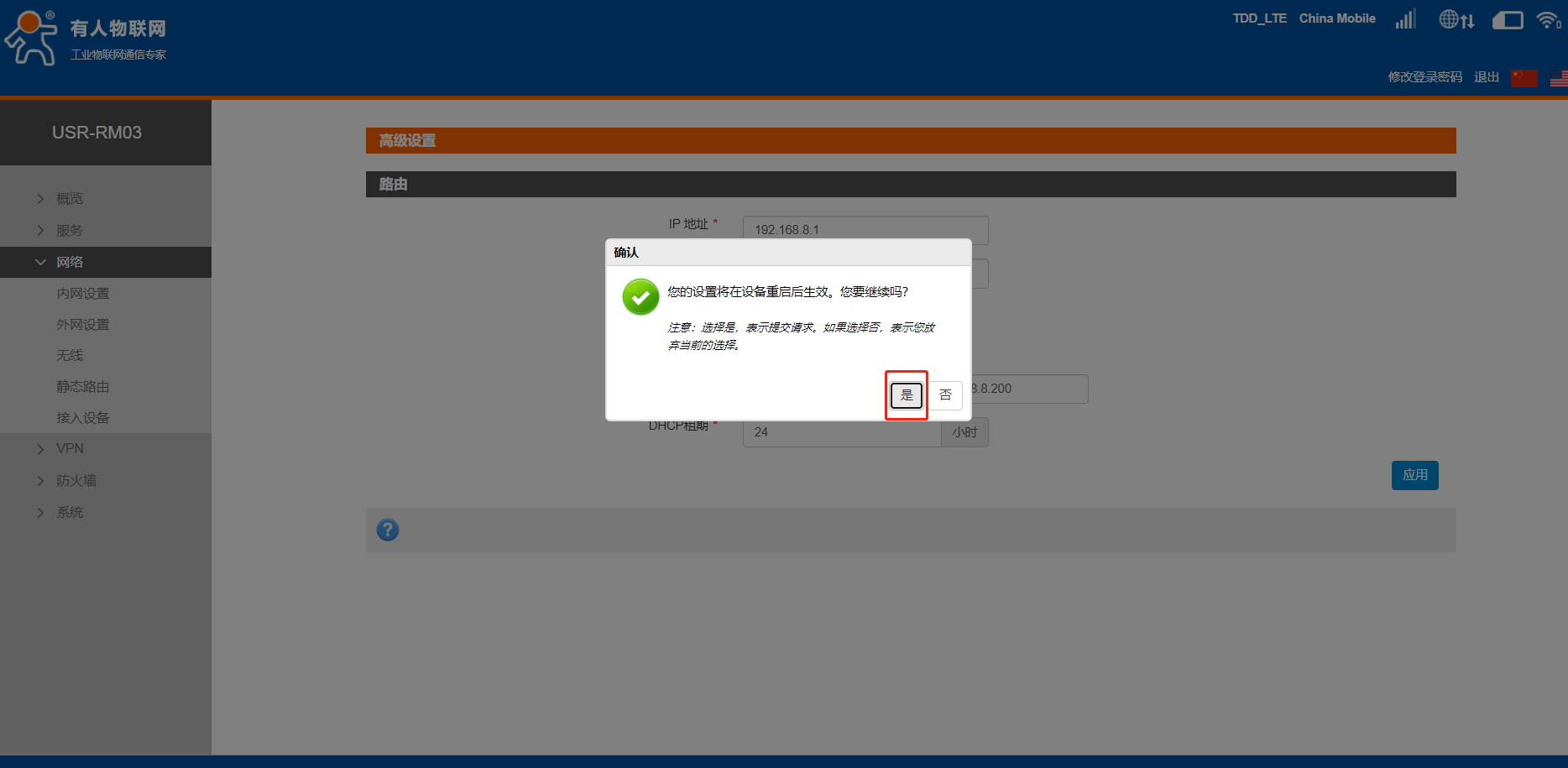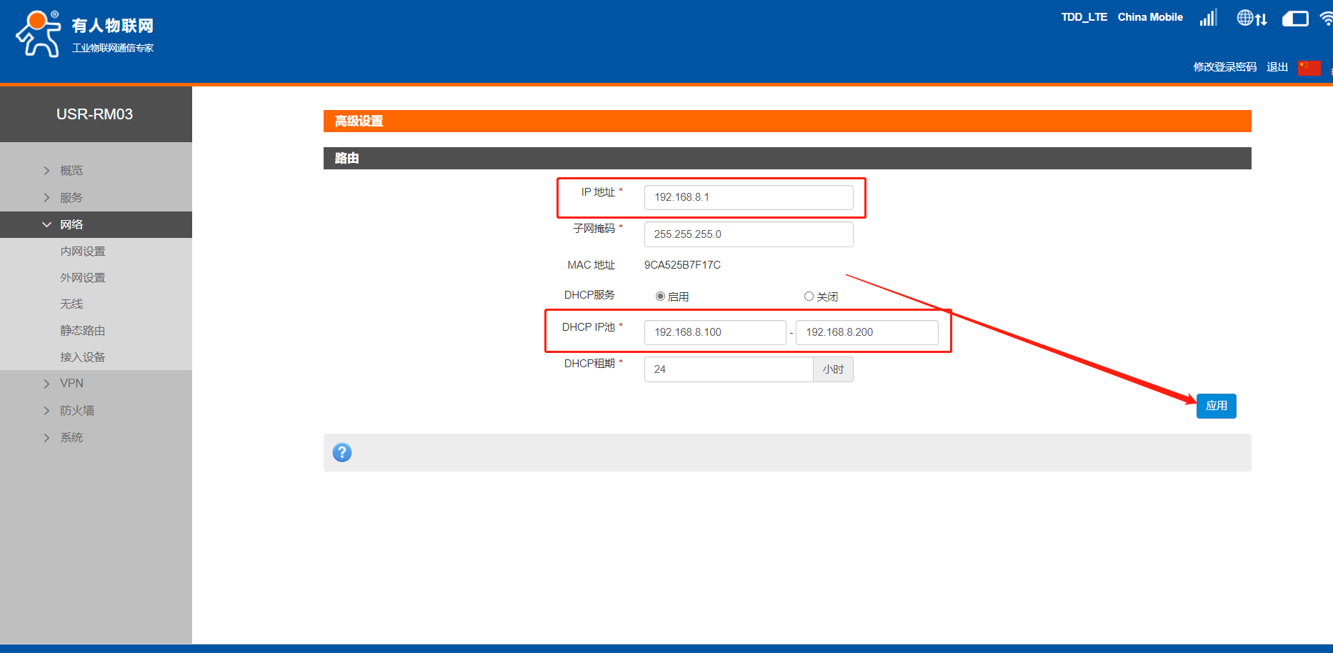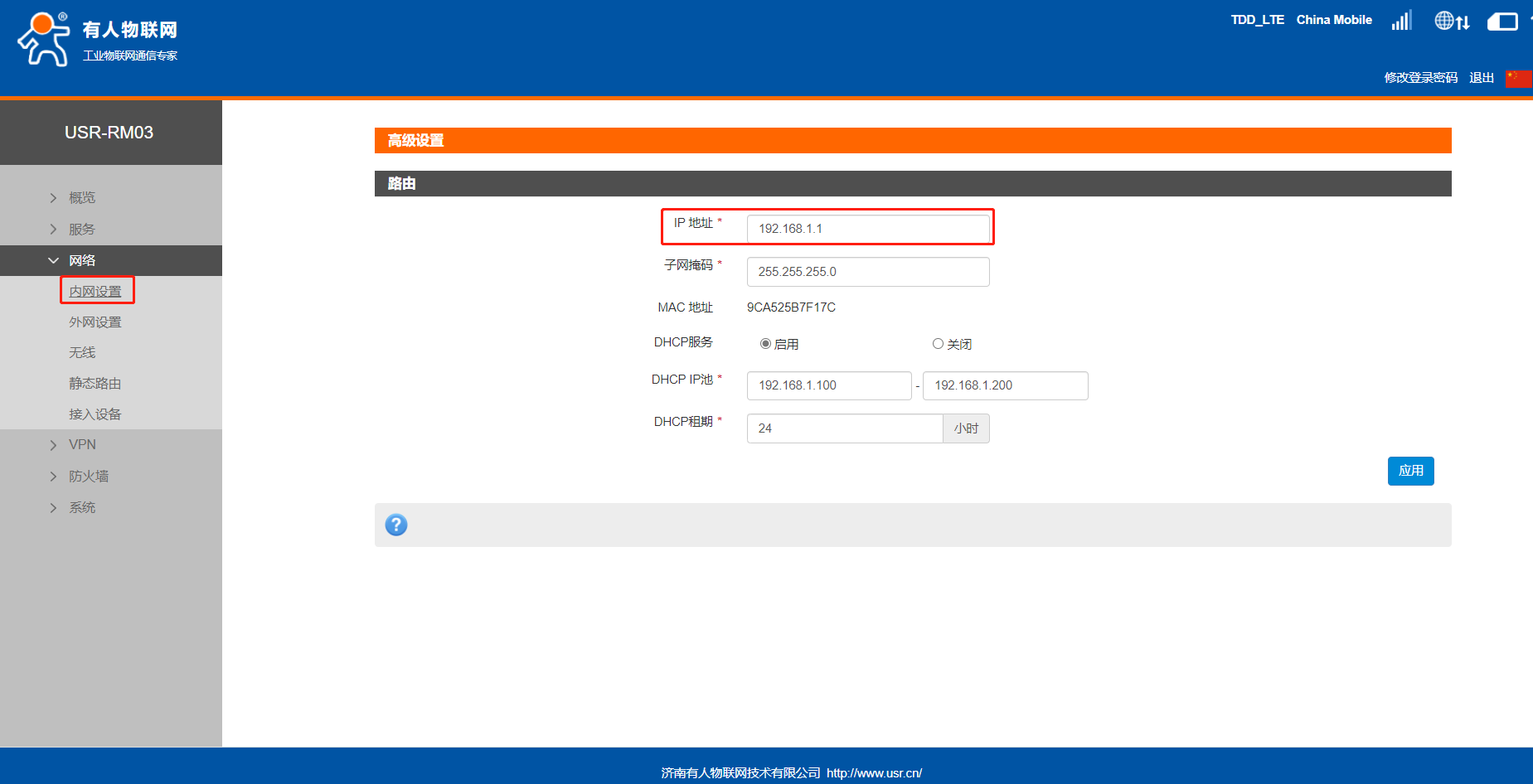 4、修改LAN口IP網(wǎng)段。進(jìn)入網(wǎng)絡(luò)--內(nèi)網(wǎng)設(shè)置,進(jìn)入修改界面,出廠默認(rèn),RM03的LAN口IP為192.168.1.1