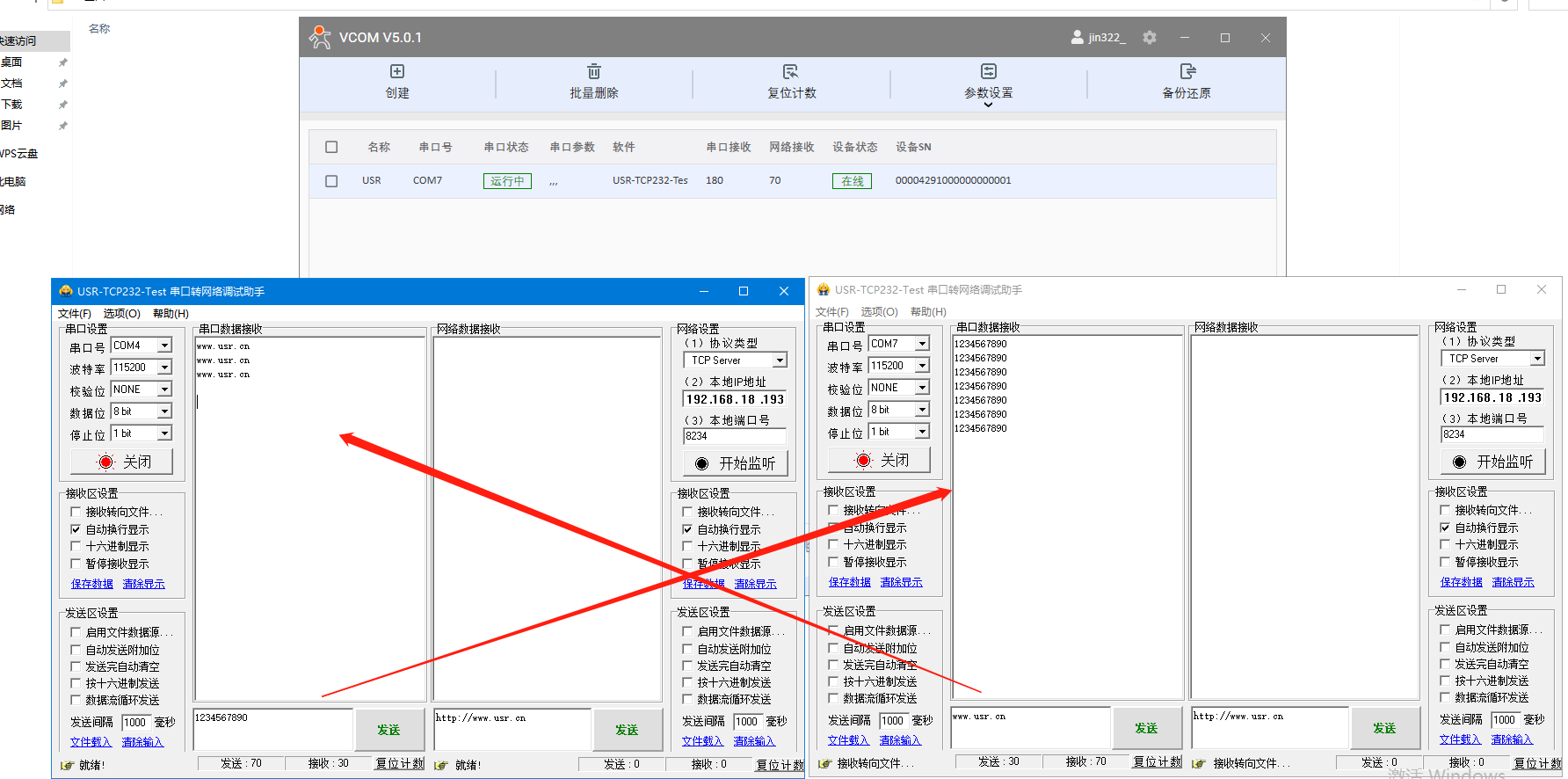 2、實(shí)際串口和虛擬串口之間測試數(shù)據(jù)通訊。