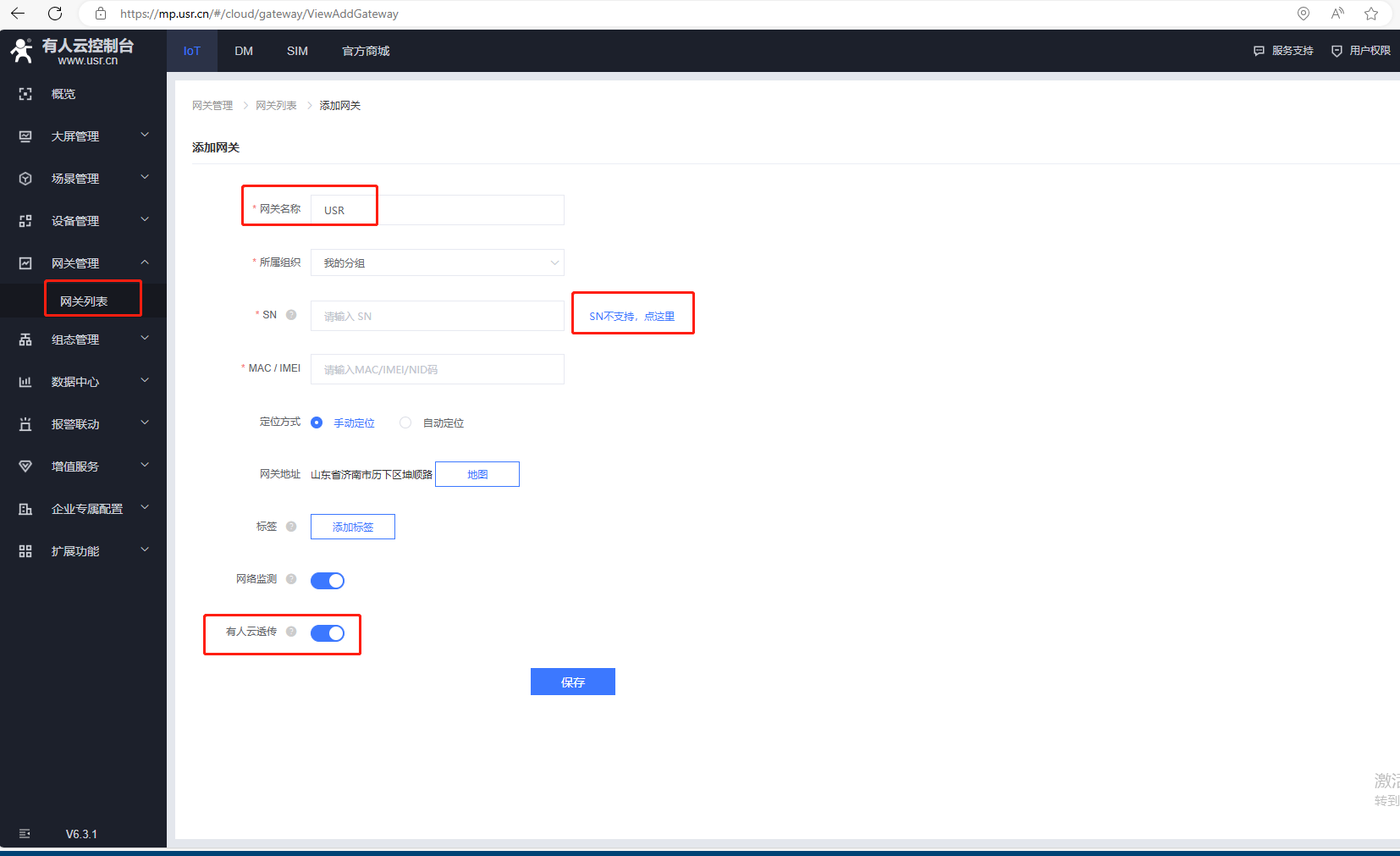 2、USR-VCOM虛擬串口添加,點(diǎn)擊SN不支持,點(diǎn)這里,用自動(dòng)生成的ID方式上云,在有人云上添加設(shè)備,勾選有人云透傳。