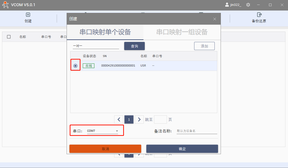 選擇串口映射單個(gè)設(shè)備,勾選在線的有人產(chǎn)品USR,用空閑的COM7作為虛擬串口的COM口號,點(diǎn)擊確定。