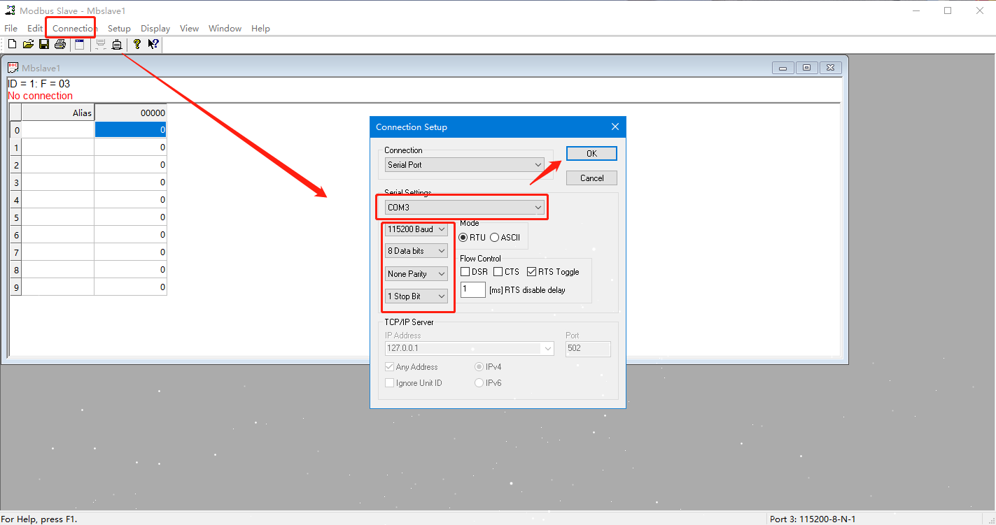 2. 打開MODBUS SLAVE軟件模擬從機,以相同的串口參數(shù)打開N580的串口。