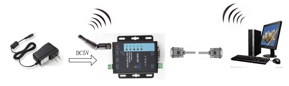 我們將 USR-W610 串口服務(wù)器的串口與計(jì)算機(jī)的串口連接,串口服務(wù)器的 WIFI 和計(jì)算機(jī)的 WIFI 連接。臺(tái)式機(jī)如無自帶串口和 WIFI,可以用 USB 轉(zhuǎn) 232 線和無線網(wǎng)卡 來替代。硬件連接如下圖: