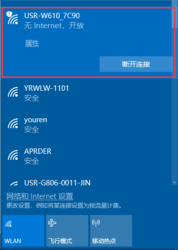 1、電腦打開無線網(wǎng)絡(luò)連接,搜索網(wǎng)絡(luò),如下圖的“USR-W610_xxxx”(xxxx 是 MAC 地址后四位)即是模塊的默認(rèn)網(wǎng)絡(luò)名稱(SSID)。電腦關(guān)閉防火墻與殺毒軟件并禁用除了wifi之外其他的網(wǎng)卡。