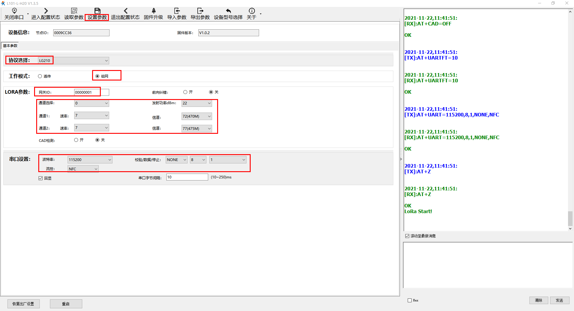 電腦打開2個(gè)USR-TCP232-TEST串口軟件,打開對(duì)應(yīng)WH-L101-L-H20和USR-LG210的USB-RS232串口線COM口號(hào),USR-LG210串口發(fā)送十六進(jìn)制數(shù)據(jù),數(shù)據(jù)前面帶節(jié)點(diǎn)ID,WH-L101-L-H20串口接收十六進(jìn)制數(shù)據(jù)。這樣USR-LG210可以指定向WH-L101-L-H20發(fā)送數(shù)據(jù)。