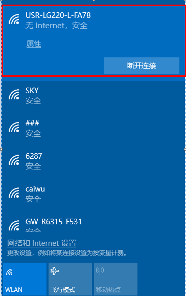 電腦無線網卡搜索并連接USR-LG220的WiFi,WiFi密碼是helipaomo.cn。其他網卡禁用,打開控制面板,