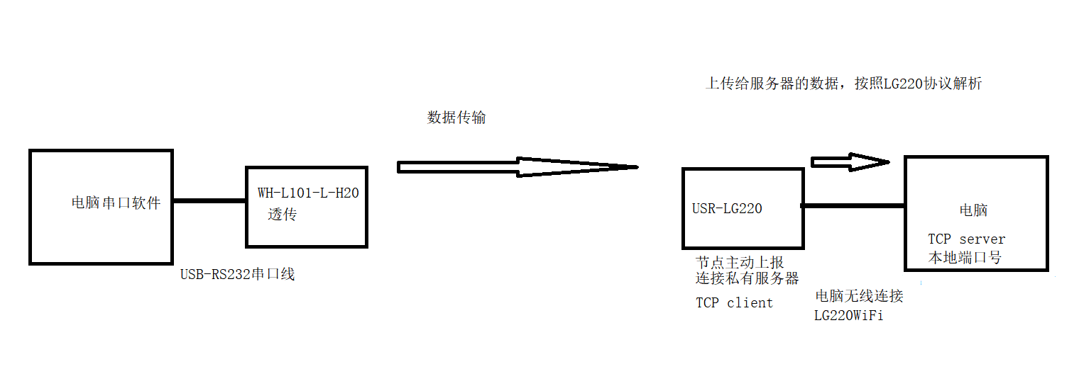 WH-L101-L-H20串口可以直接發(fā)送數據,USR-LG220 TCP client連接的TCP server服務器接收USR-LG220協(xié)議的數據。
