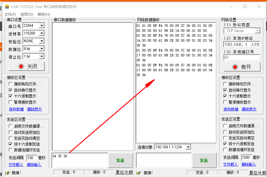 電腦打開1個USR-TCP232-TEST串口軟件,勾選十六進制顯示和按十六進制發(fā)送。