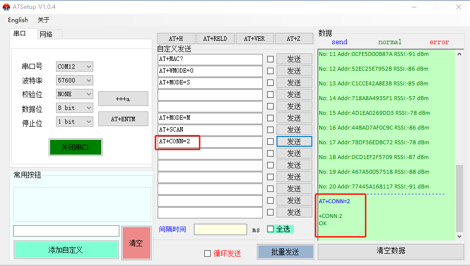 AT+CONN=MAC(MAC為從設(shè)備模式MAC地址,從設(shè)備模式可通過AT+MAC查詢)