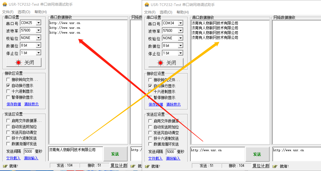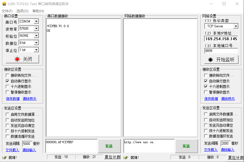 關(guān)閉AT指令設(shè)置軟件的串口后打開串口測(cè)試軟件,可以進(jìn)行數(shù)據(jù)透?jìng)魍ㄐ艤y(cè)試。
