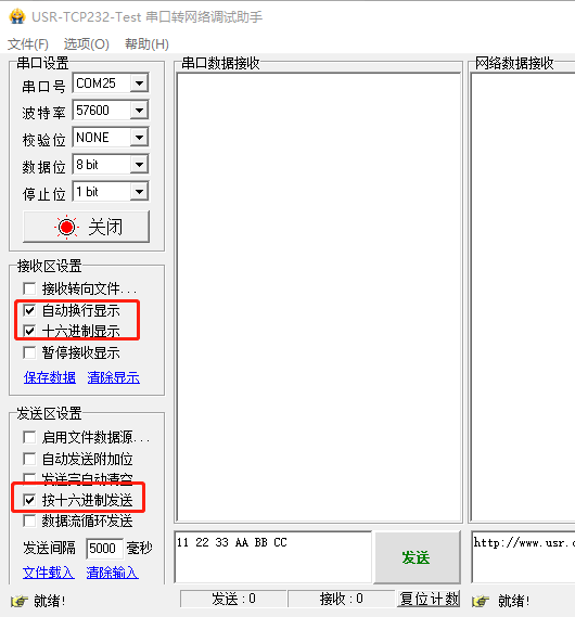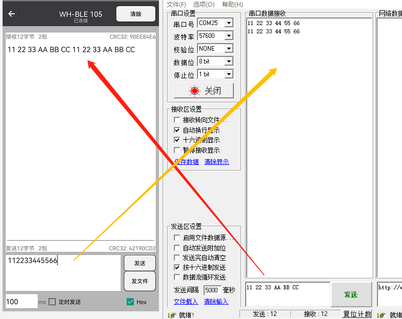 11. 準備一個BLE105,串口接電腦,用電腦串口調試助手打開,勾選16進制顯示與按16進制發(fā)送,藍牙串口默認參數(shù):波特率57600、無校驗位、數(shù)據(jù)位8、停止位1。