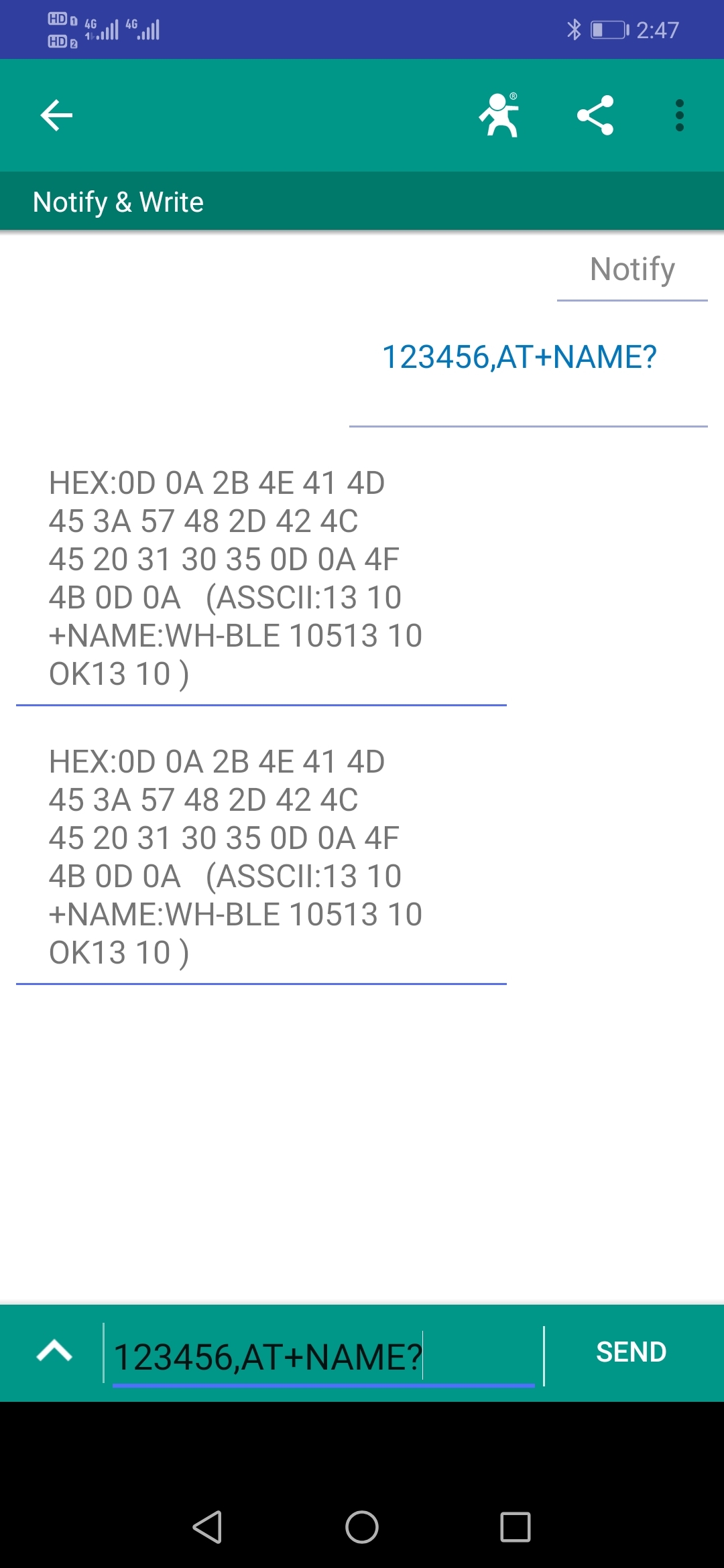 可以正常查詢出WH-BLE105 的名稱。透傳AT指令測試完成。