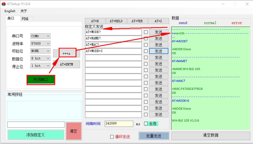 電腦打開串口AT指令設置軟件,查詢WH-BLE105的MAC,設置從機模式