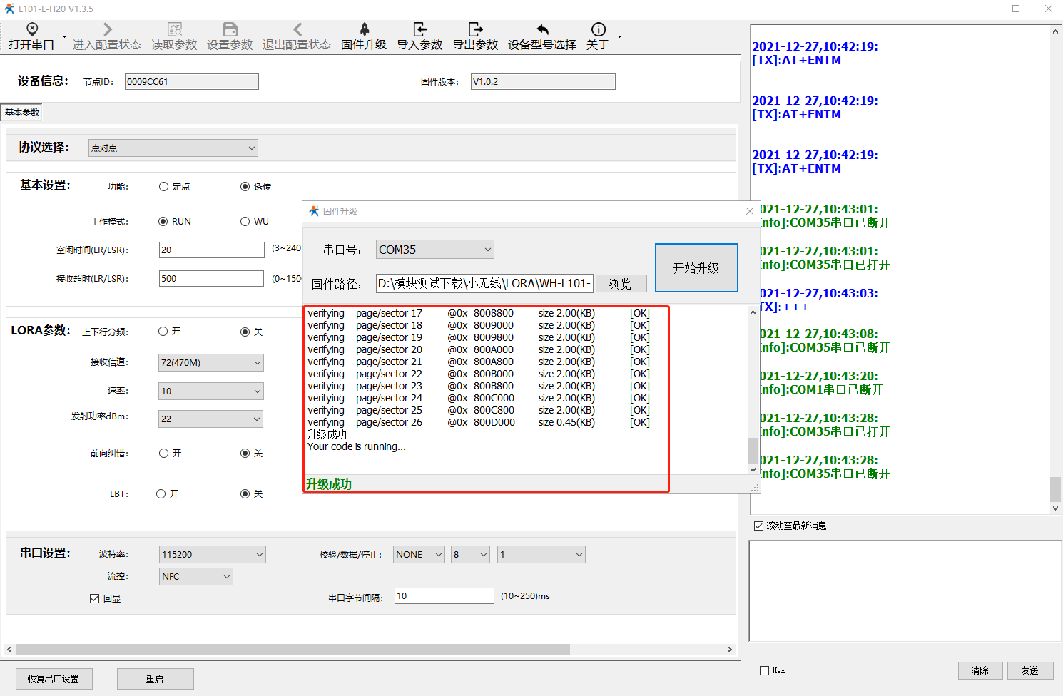 3、參數(shù)讀完點(diǎn)擊“固件升級”,選擇對應(yīng)COM串口,選擇固件路徑后直接給101-L斷電,按住“Reload”鍵不放(Reload管腳電平狀態(tài)持續(xù)拉低),給101設(shè)備上電,點(diǎn)擊“開始升級”。