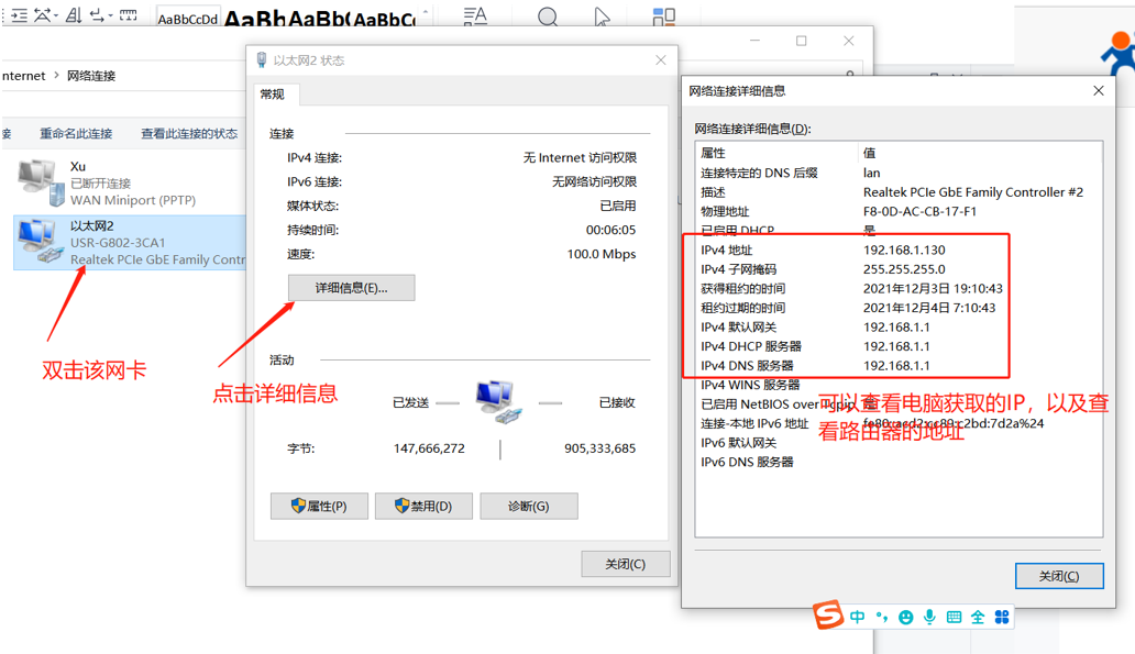 2) 雙擊該網(wǎng)卡,可以顯示詳細信息,查看電腦獲取的IP以及路由器的地址