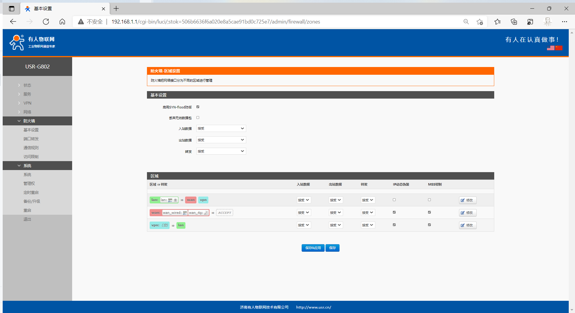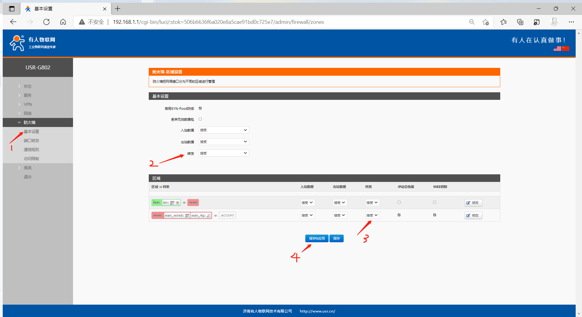 點擊保存并應(yīng)用,然后點擊防火墻-->基本設(shè)置,如下圖