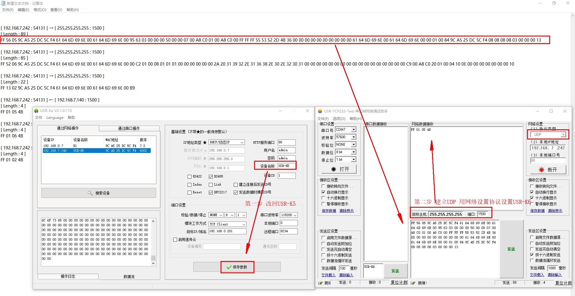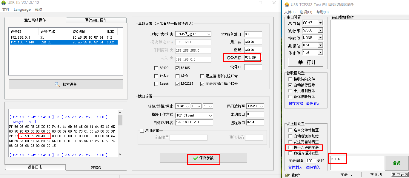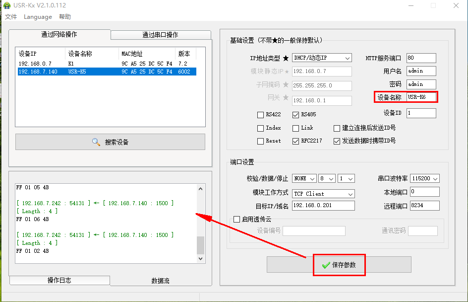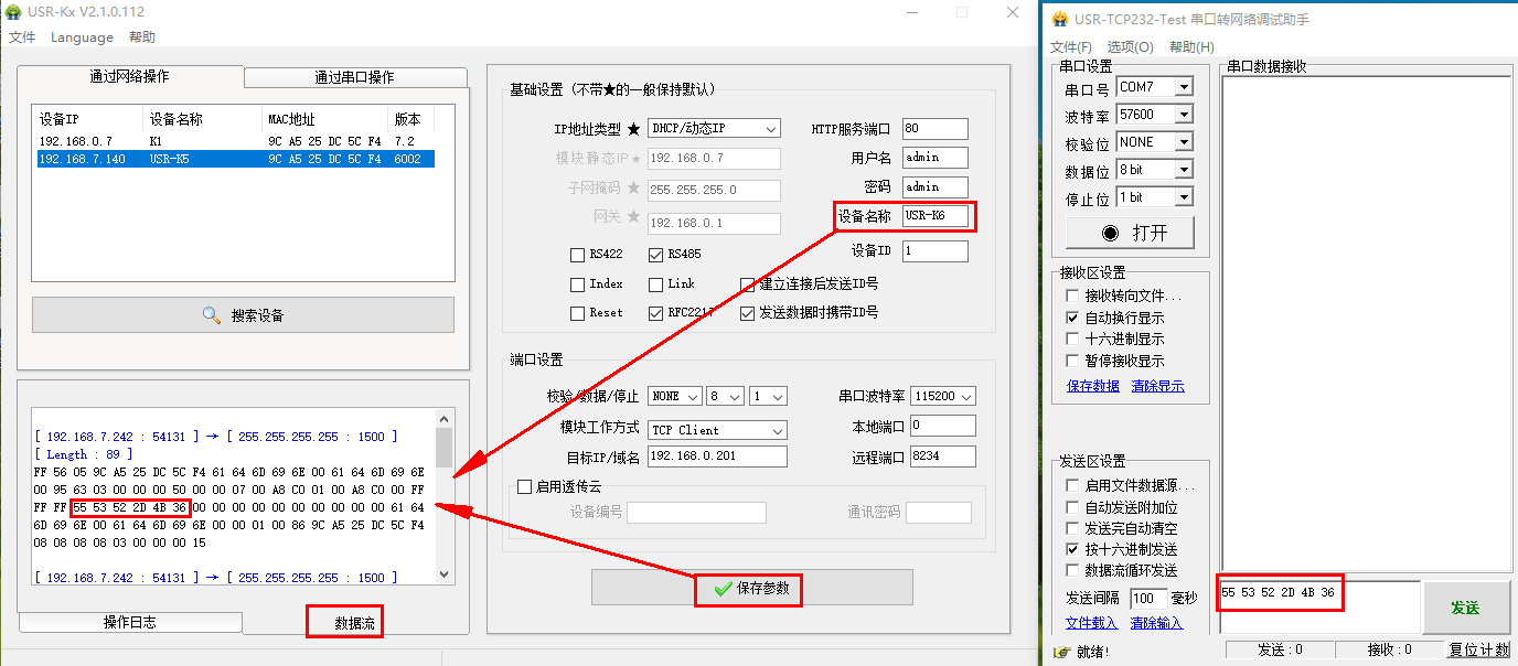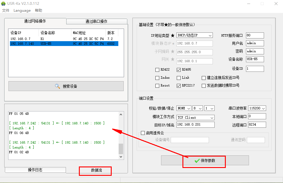二、USR-K5使用USR-Kx軟件,點(diǎn)擊保存參數(shù),數(shù)據(jù)流可以查看對應(yīng)的網(wǎng)絡(luò)協(xié)議。