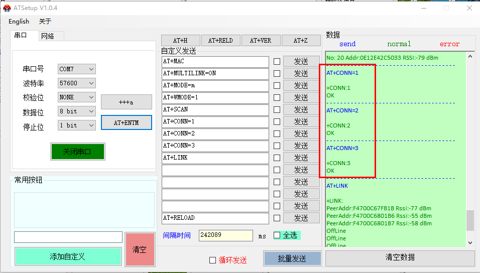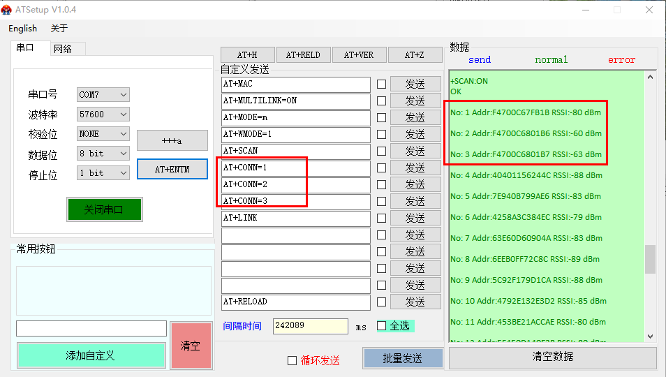 (3)根據(jù)掃描結(jié)果進(jìn)行連接,依次發(fā)送AT+CONN=1、AT+CONN=2、AT+CONN=3,連接3個(gè)從機(jī)