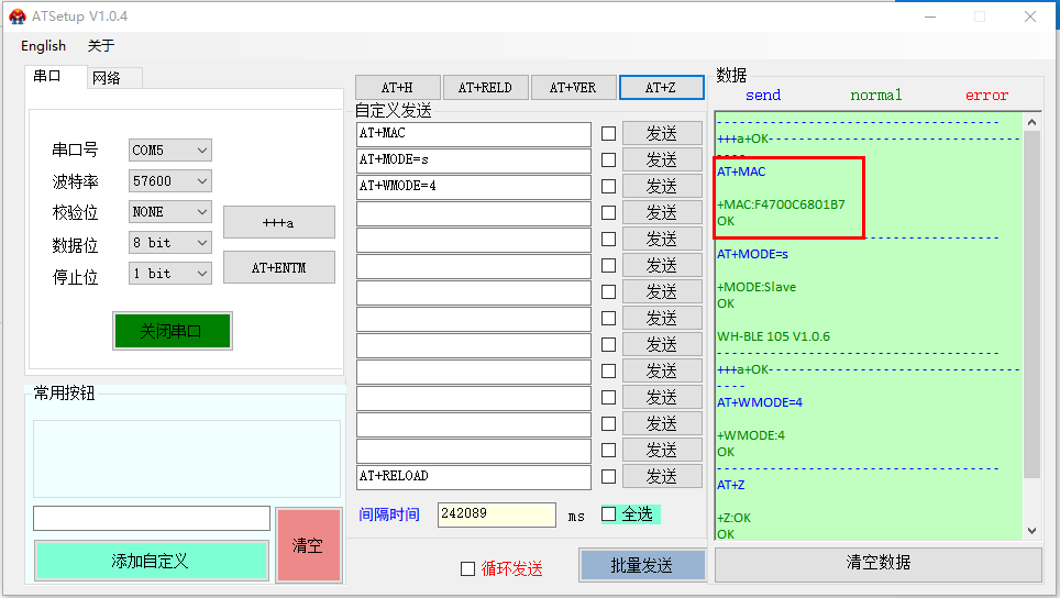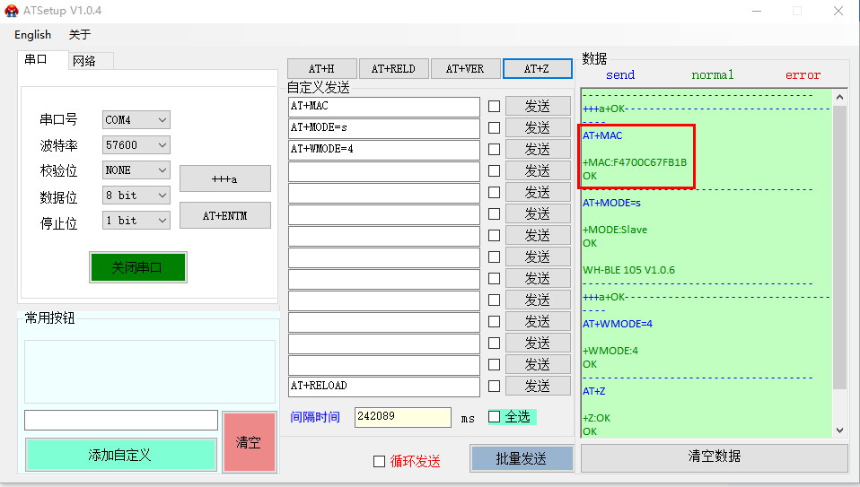 (2)發(fā)送AT+MAC查詢主機(jī)MAC:F4 70 0C 67 FB 21