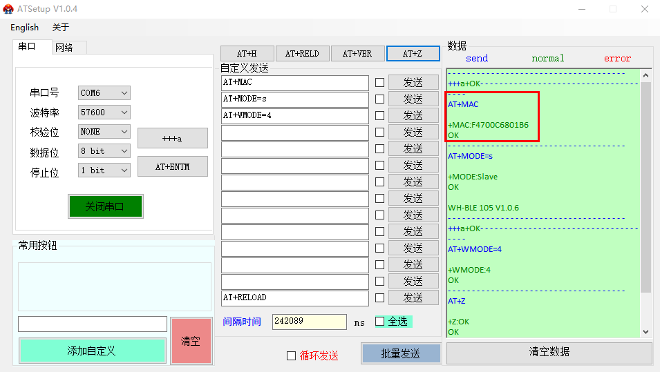 (2)發(fā)送AT+MAC查詢從機(jī)MAC:F4 70 0C 68 01 B6