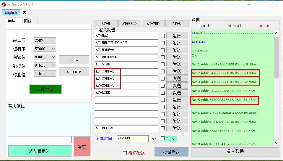 (3)根據(jù)掃描結(jié)果進(jìn)行連接,依次發(fā)送AT+CONN=2、AT+CONN=3、AT+CONN=5,連接3個從機(jī)