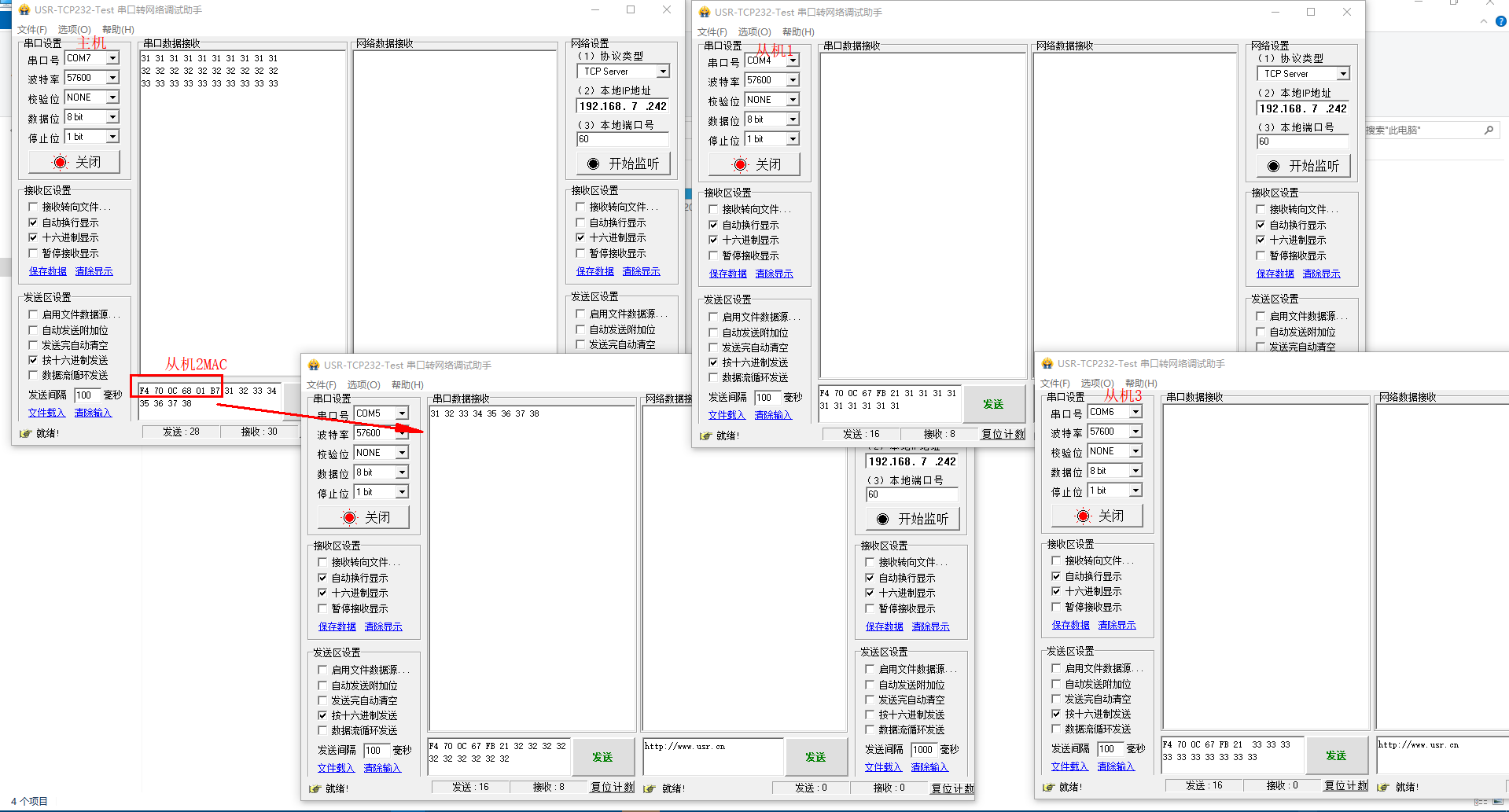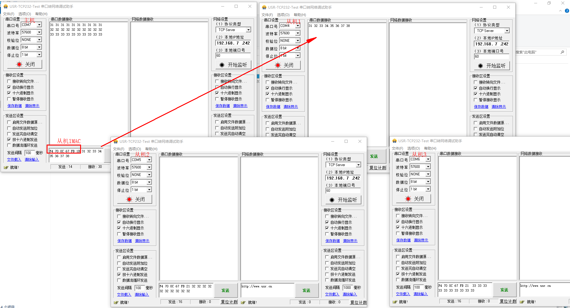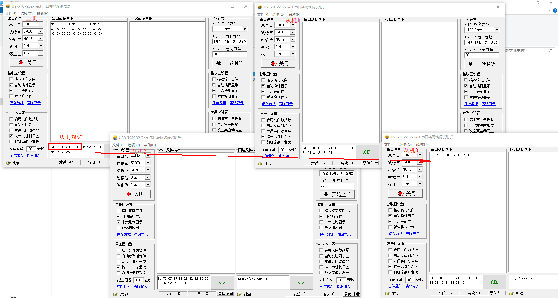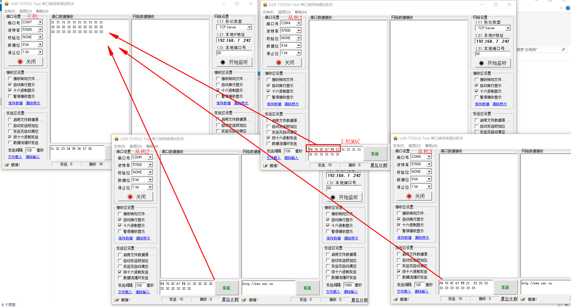 備注:COM7 接的主機(jī),COM4接的從機(jī)1,COM5接的從機(jī)2,COM6接的從機(jī)3。