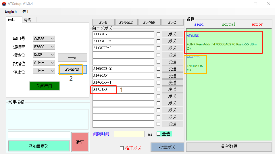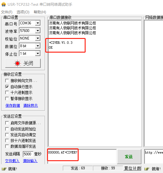 關閉AT指令設置軟件的串口后打開串口測試軟件,可以進行數(shù)據(jù)透傳通信測試。