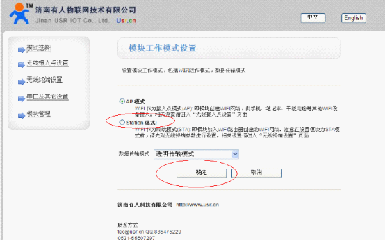 2.在頁面首頁將模塊的工作方式改為STA模式,點擊確定。(此時網(wǎng)頁會提示重啟模塊,先不要重啟,全部設(shè)置完成后再重啟模塊)