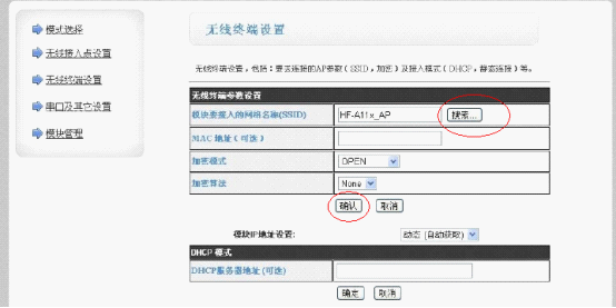 3.登錄無線終端設(shè)置界面,點擊搜索按鈕,選擇要加入的無線AP,再填入準(zhǔn)確的密碼,點擊確認(rèn)。如果需要給模塊設(shè)置固定IP,請在下面的“模塊IP地址設(shè)置”選項中設(shè)置,設(shè)置完成后同樣需要點擊確定。