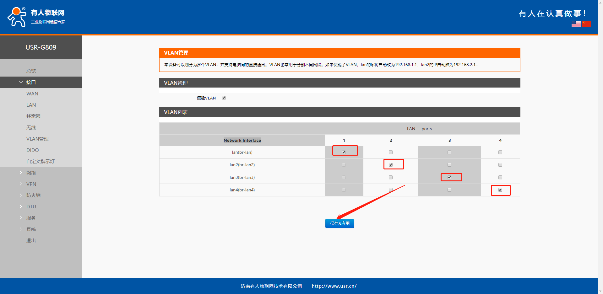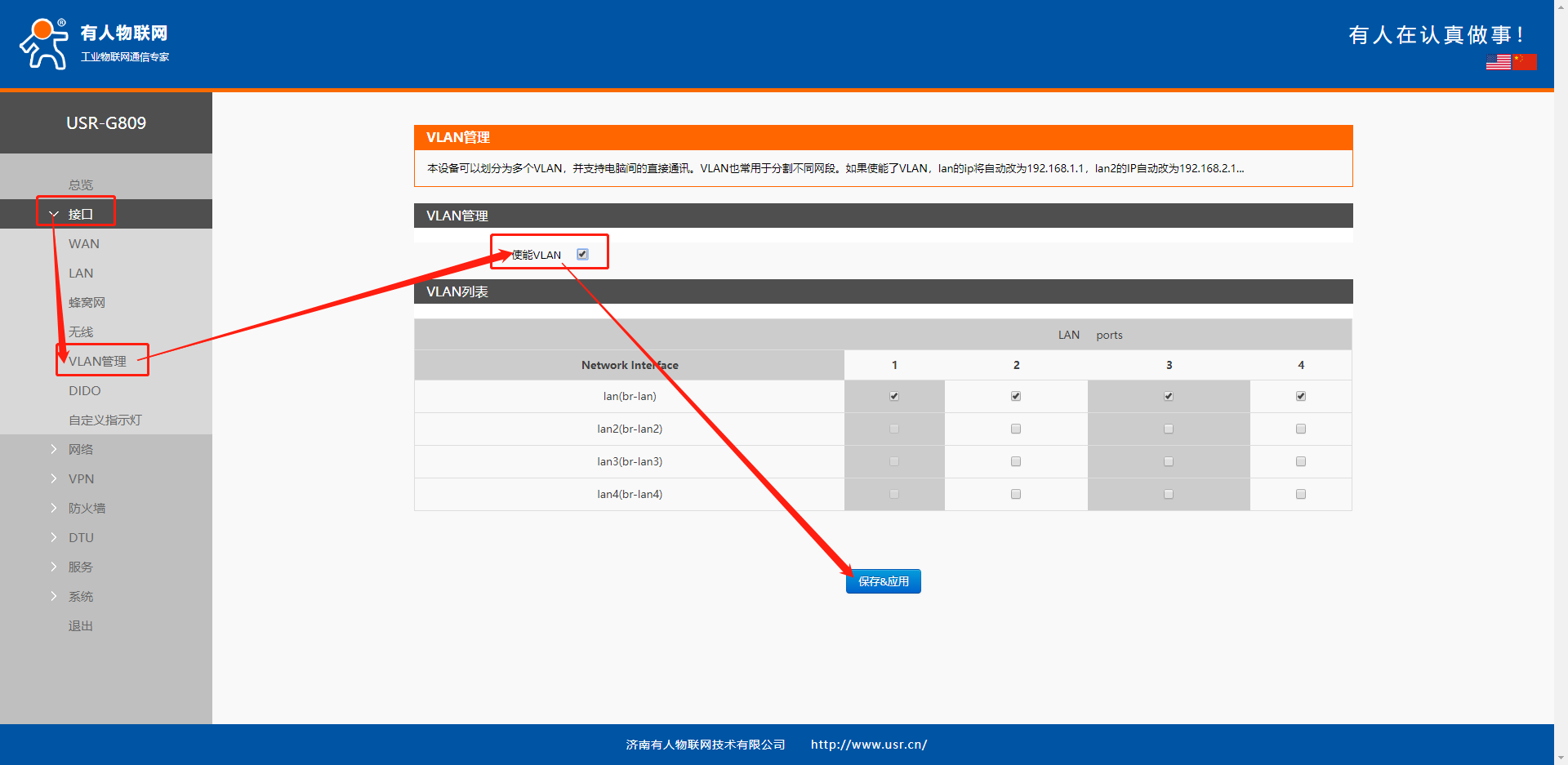 3、進入接口-VLAN管理界面,使能VLAN,勾選上則為開啟此功能,保存并應用開啟