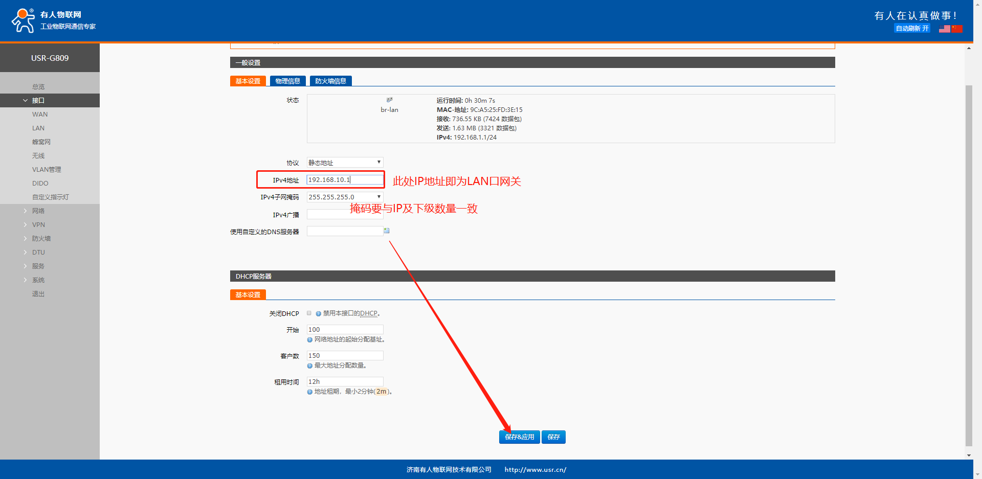 8、點擊對應接口后方的修改,即可修改該接口的網(wǎng)段。要注意,若設備WAN口(包括WAN_4G和WAN_WIRED)已有IP,則LAN口(包括LAN1-4)IP不能與WAN口一致。參數(shù)全部修改完成后點擊下方保存并應用。此處以LAN接口為例進行設置,其余幾個LAN口設置方式一致