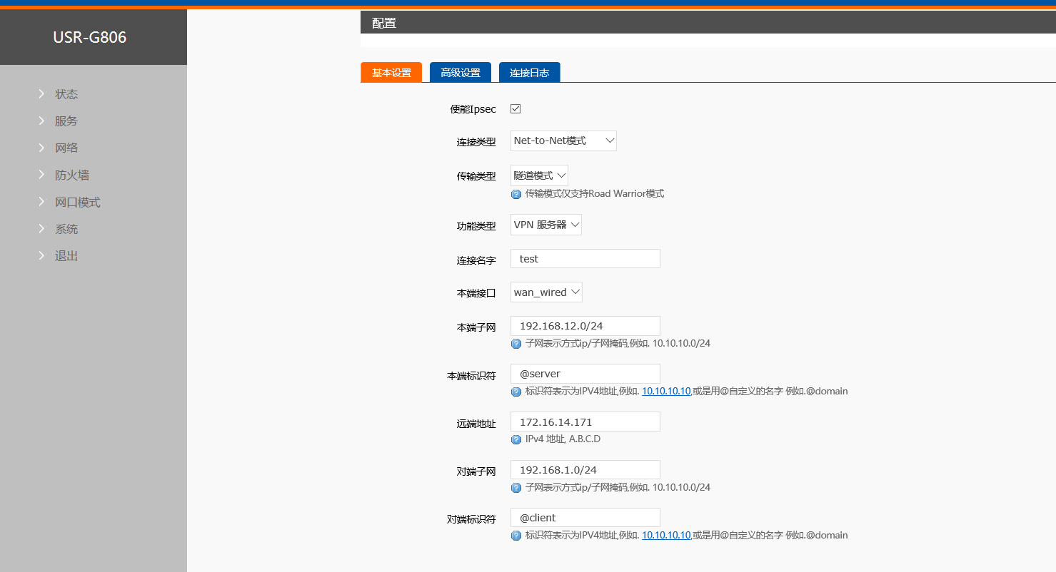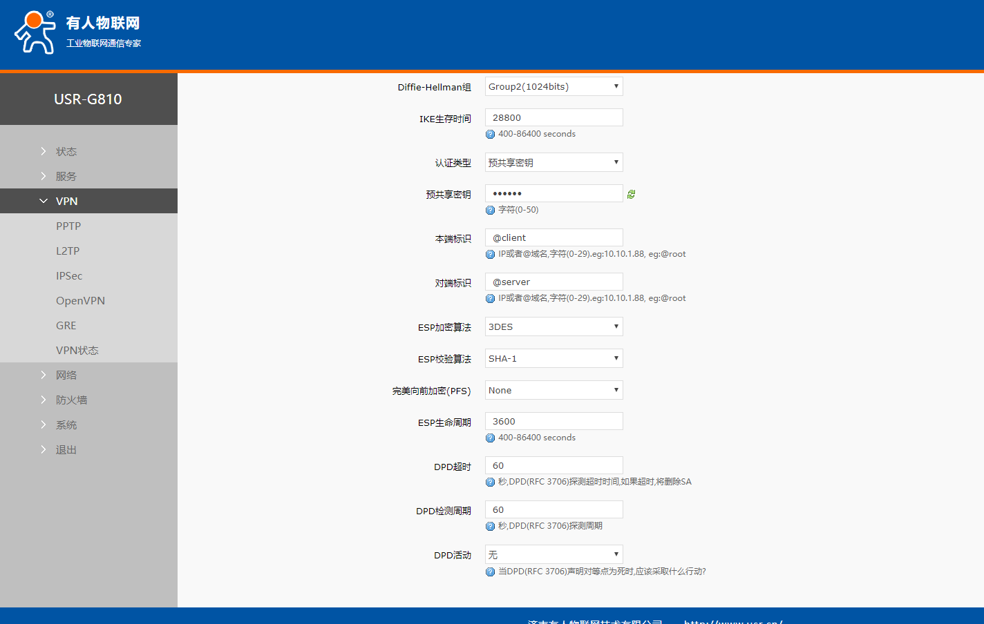 邏輯與G806的設(shè)置完全一致,協(xié)商方法、隧道類型、IKE及ESP加密方式、認(rèn)證方式、預(yù)共享密鑰全部與G806VPN服務(wù)器的參數(shù)一致,本端子網(wǎng)及標(biāo)識符、對端子網(wǎng)及標(biāo)識符與G806VPN服務(wù)器的設(shè)置相反