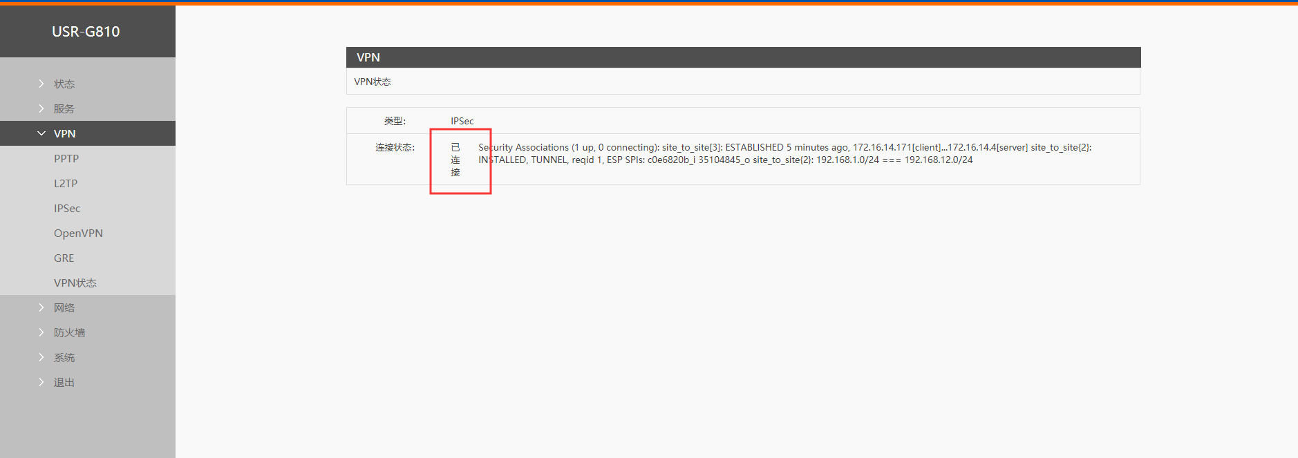 3、測試結(jié)果:在 VPN 狀態(tài)處可查看到“IPSec 已連接”提示,說明IPSEC已成功連接