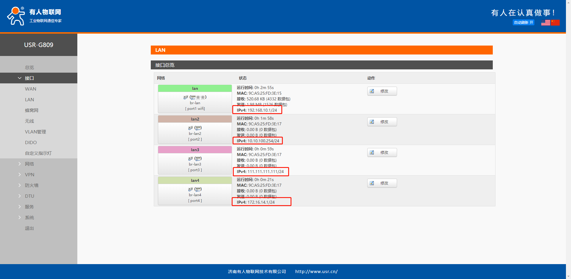 9、這里測試將LAN口設(shè)置為192.168.10.1,LAN2設(shè)置為10.10.100.254,LAN3設(shè)置為111.111.111.111,LAN4設(shè)置為172.16.14.1