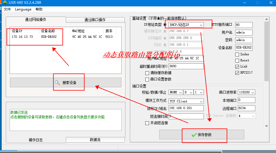 4. 修改成動(dòng)態(tài)獲取(DHCP/動(dòng)態(tài)ip),保存參數(shù)——重新搜索。然后可以看到路由器分配給DR302的動(dòng)態(tài)ip,打開瀏覽器輸入路由器分配的ip進(jìn)內(nèi)置網(wǎng)頁,用戶名和密碼都是admin