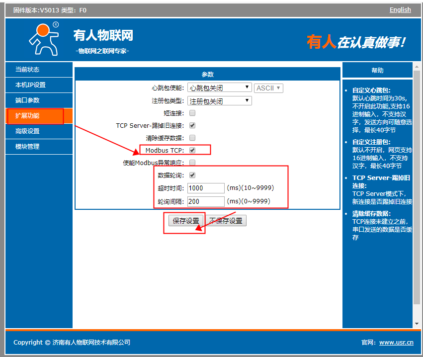 6. 在“擴(kuò)展功能”勾選“Modbus Tcp”,開啟輪詢功能、設(shè)置輪詢參數(shù),設(shè)置完成后點(diǎn)擊“保存設(shè)置”。