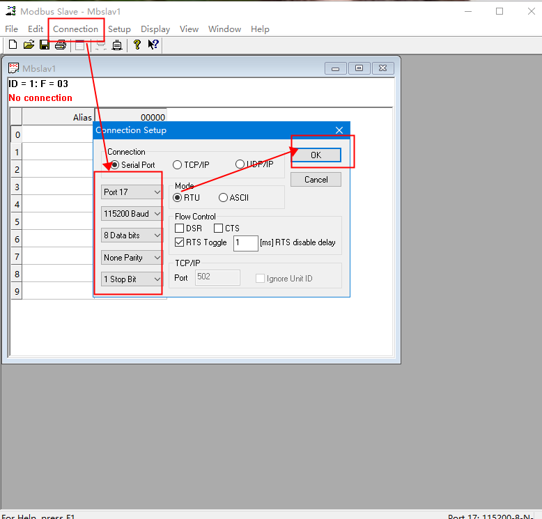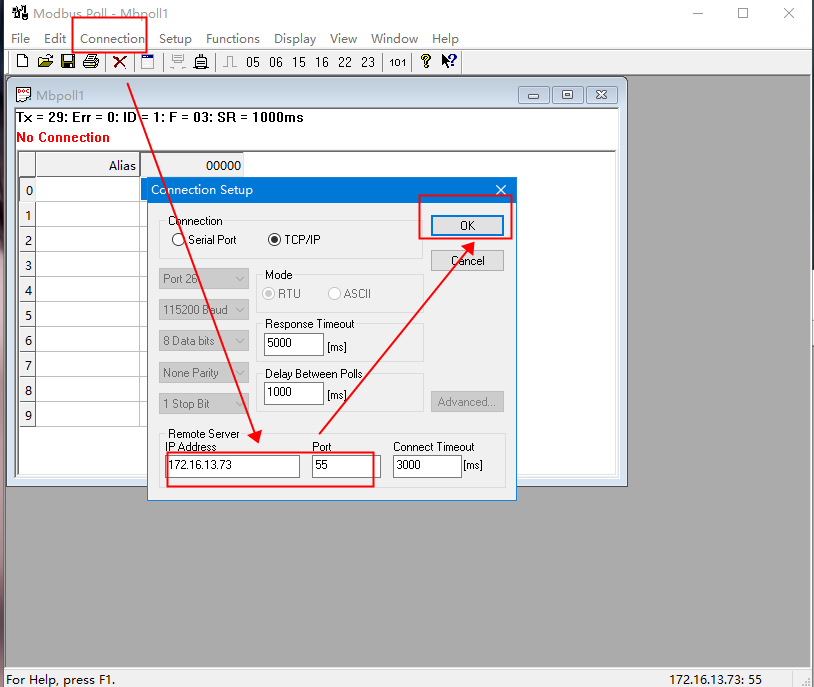 MODBUS POLL軟件設(shè)置MODBUS TCP/IP。IP地址填DR302的IP地址,Server Port填DR302的端口號(hào)55。注意MODBUS POLL軟件的3個(gè)時(shí)間參數(shù),依次是
