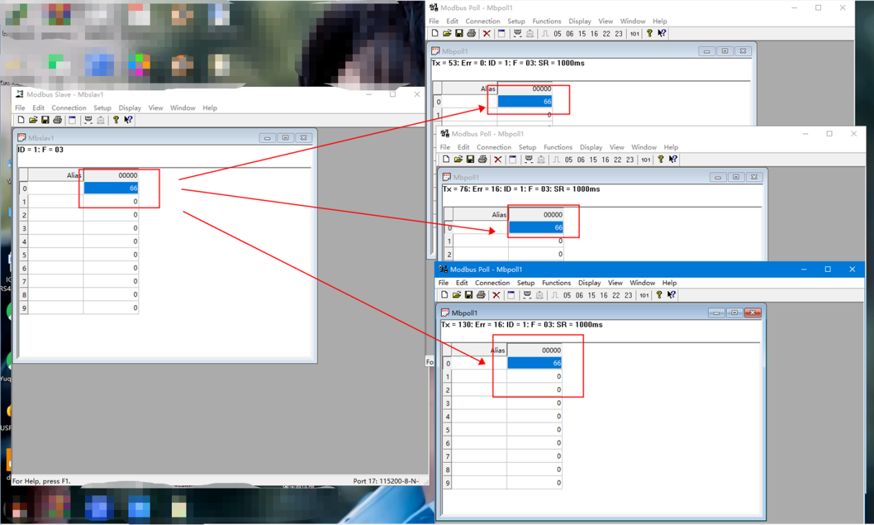 8. 模擬測試用MODBUS SLAVE軟件做串口設(shè)備,3個(gè)MODBUS POLL軟件做網(wǎng)絡(luò)端。