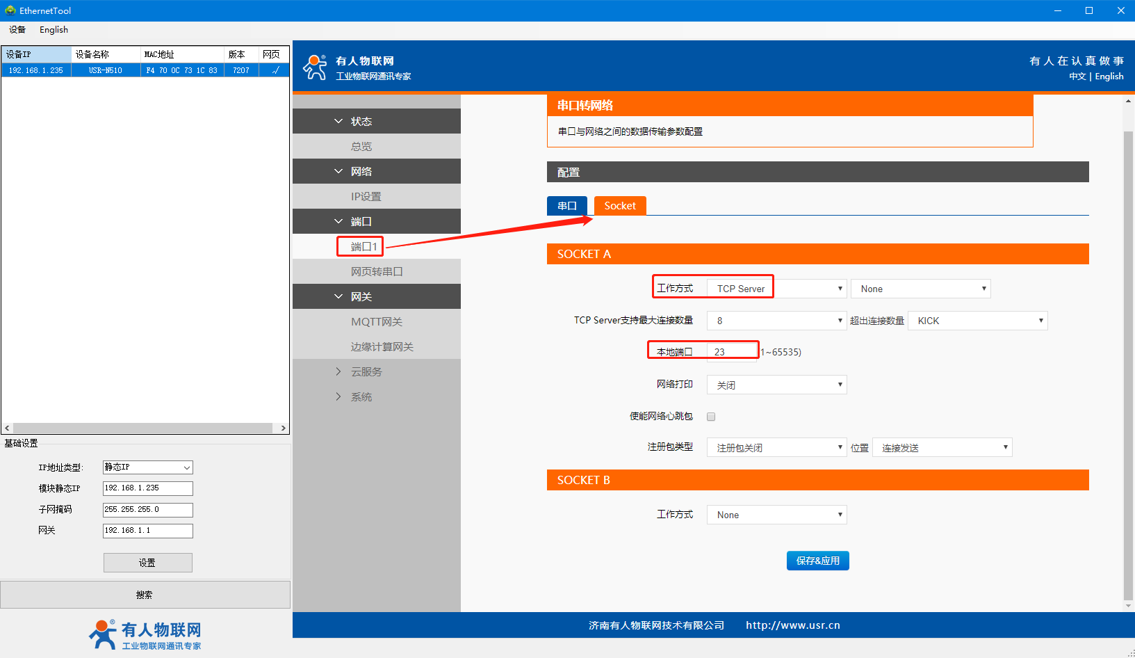 4>設置socket(網(wǎng)絡)參數(shù):在本案例中保持N510-H7的默認參數(shù)