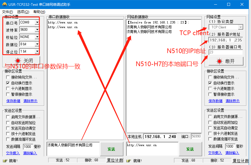 打開串口網(wǎng)絡二合一調(diào)試工具,實現(xiàn)串口與網(wǎng)絡端的雙向數(shù)據(jù)傳輸。