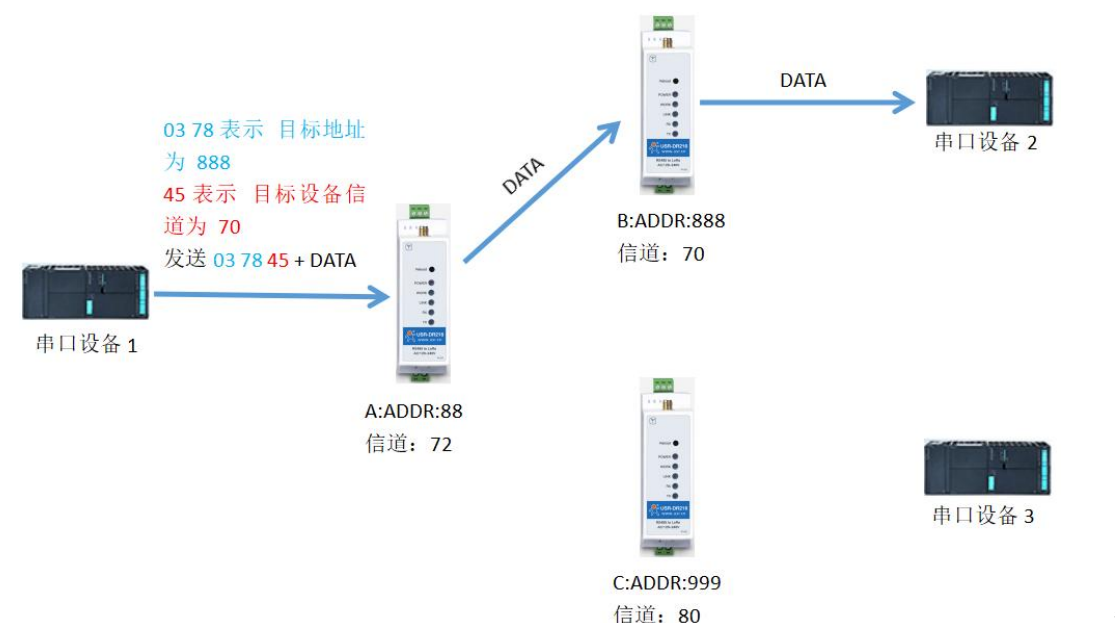 如下圖所示,當(dāng)一臺 LoRa 數(shù)傳終端 A(目標(biāo)地址(ADDR):88,信道(CH):72)想向另一臺 LoRa 數(shù)傳終端 B(目標(biāo)地址(ADDR): 888,信道(CH):70)發(fā)送數(shù)據(jù) DATA(123456),則只需要按照 16 進(jìn)制發(fā)送(03 78 46 31 32 33 34 35 36),則 LoRa 數(shù)傳終端 B 接收到 數(shù)據(jù)(31 32 33 34 35 36)。
