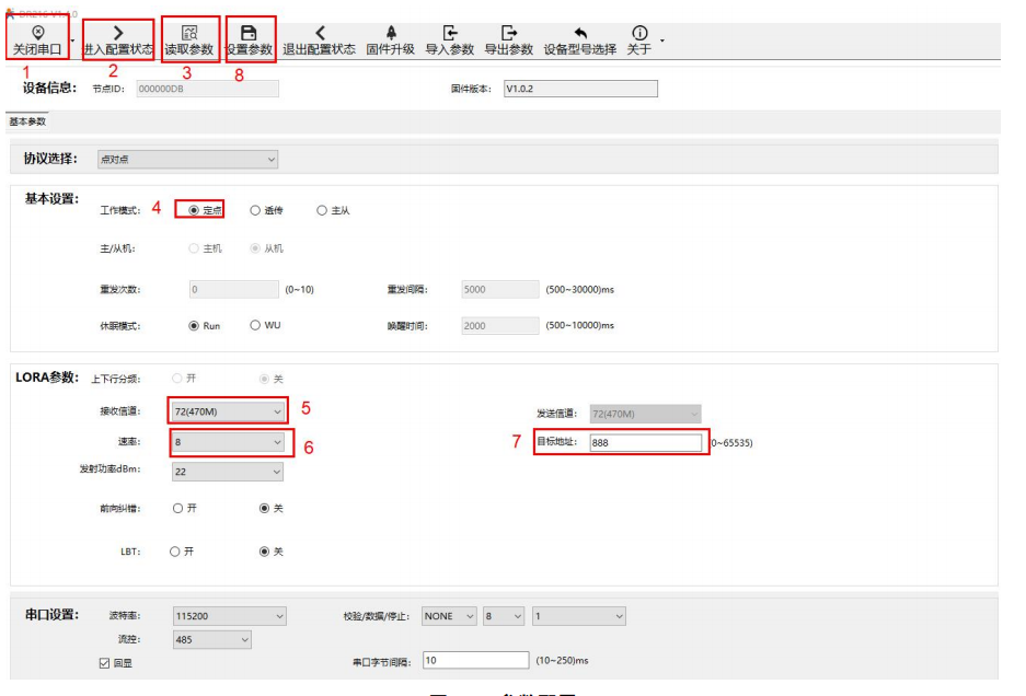 根據(jù)上面的步驟打開設(shè)備B的串口,配置設(shè)備B的參數(shù)為:定點(diǎn)模式,速率8,信道70,目標(biāo)地址888。