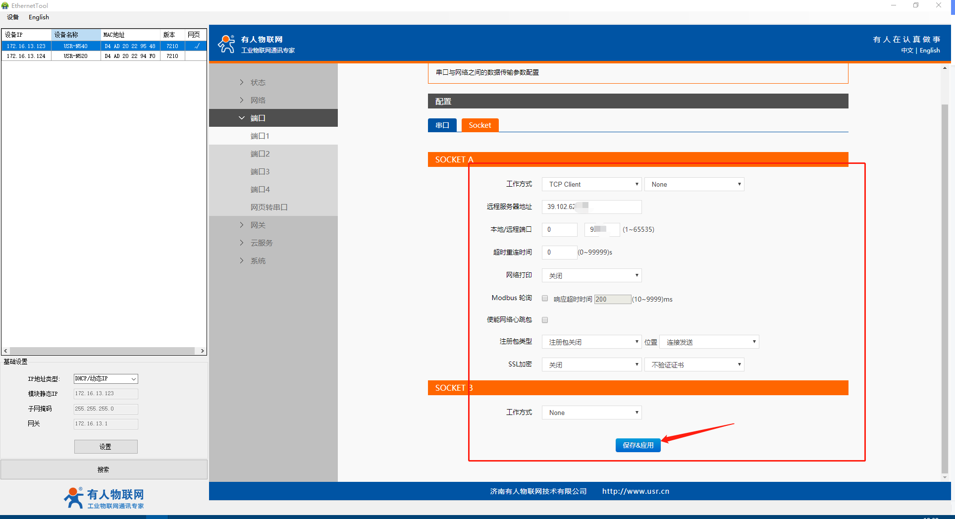 N540端口1工作方式設(shè)置TCP client模式,填寫(xiě)服務(wù)器的IP地址和端口號(hào),,用戶(hù)在使用時(shí)不可以依照次ip與端口來(lái)進(jìn)行配置,需要連接自己服務(wù)器的ip與端口。