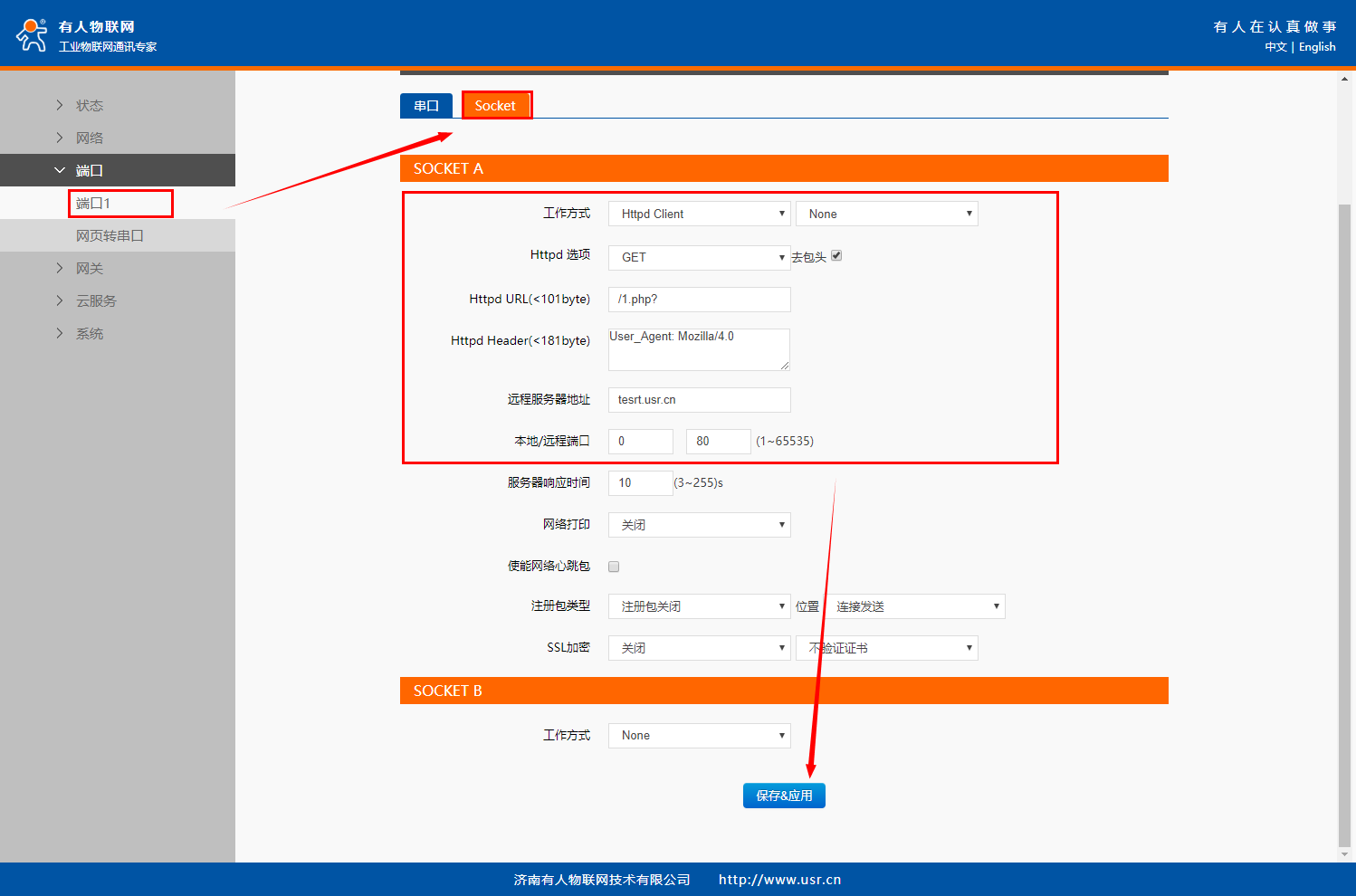 在“端口”>“端口1”界面中的“Socet”配置Socket A的工作模式為“Httpd Clinet”