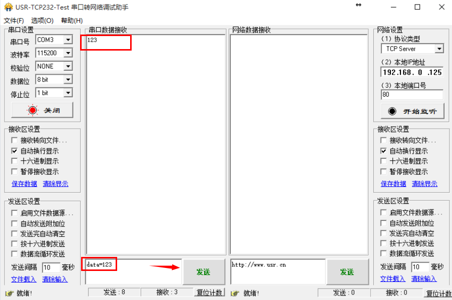 10、N510用485轉(zhuǎn)usb串口線接電腦,用串口調(diào)試助手打開,串口發(fā)送data=123,服務(wù)器回復(fù)123。